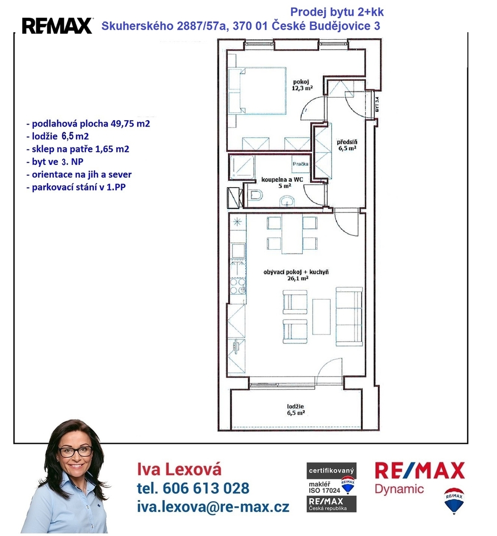 Bytová jednotka s jižně orientovanou lodžií se nachází ve druhém patře čtyřpodlažního, zděného, pět let starého bytového domu s výtahem. Dispozičně je řešena jako 2+kk s podlahovou plochou 49,75 m2 + lodžie 6,52 m2 + komora na patře 1,65 m2). Sestává se z předsíně, obývacího pokoje s kuchyňským koutem, ložnice, koupelny se sprchovým koutem a s WC.