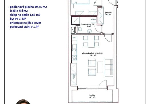 Byt je velice světlý s orientací na jih (lodžie, hlavní obytná místnost) a sever (ložnice). K bytu náleží vyhrazené parkovací stání ve společné garáží se vjezdem na dálkové ovládání v 1.PP. Prodává se vybavený kuchyňskou linkou se spotřebiči, vestavěnou šatní skříni v ložnici a šatní skříní v předsíni. Dispozici bytu s orientačními rozměry jednotlivých místností najdete na přiloženém půdorysu.
