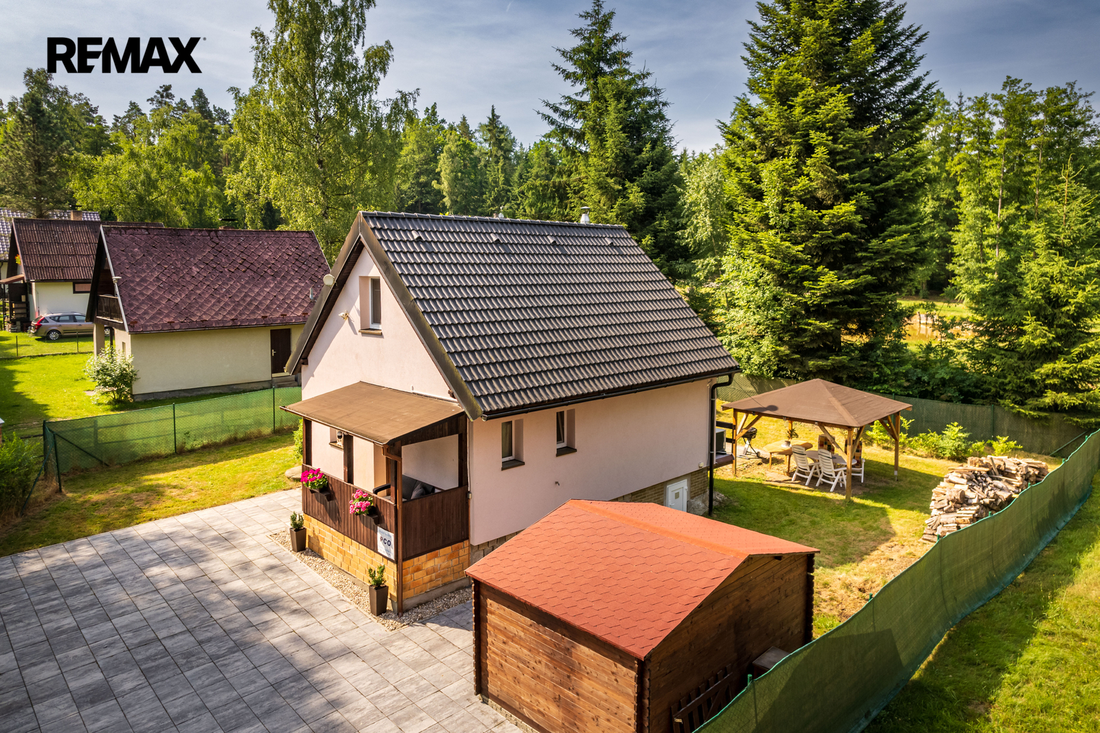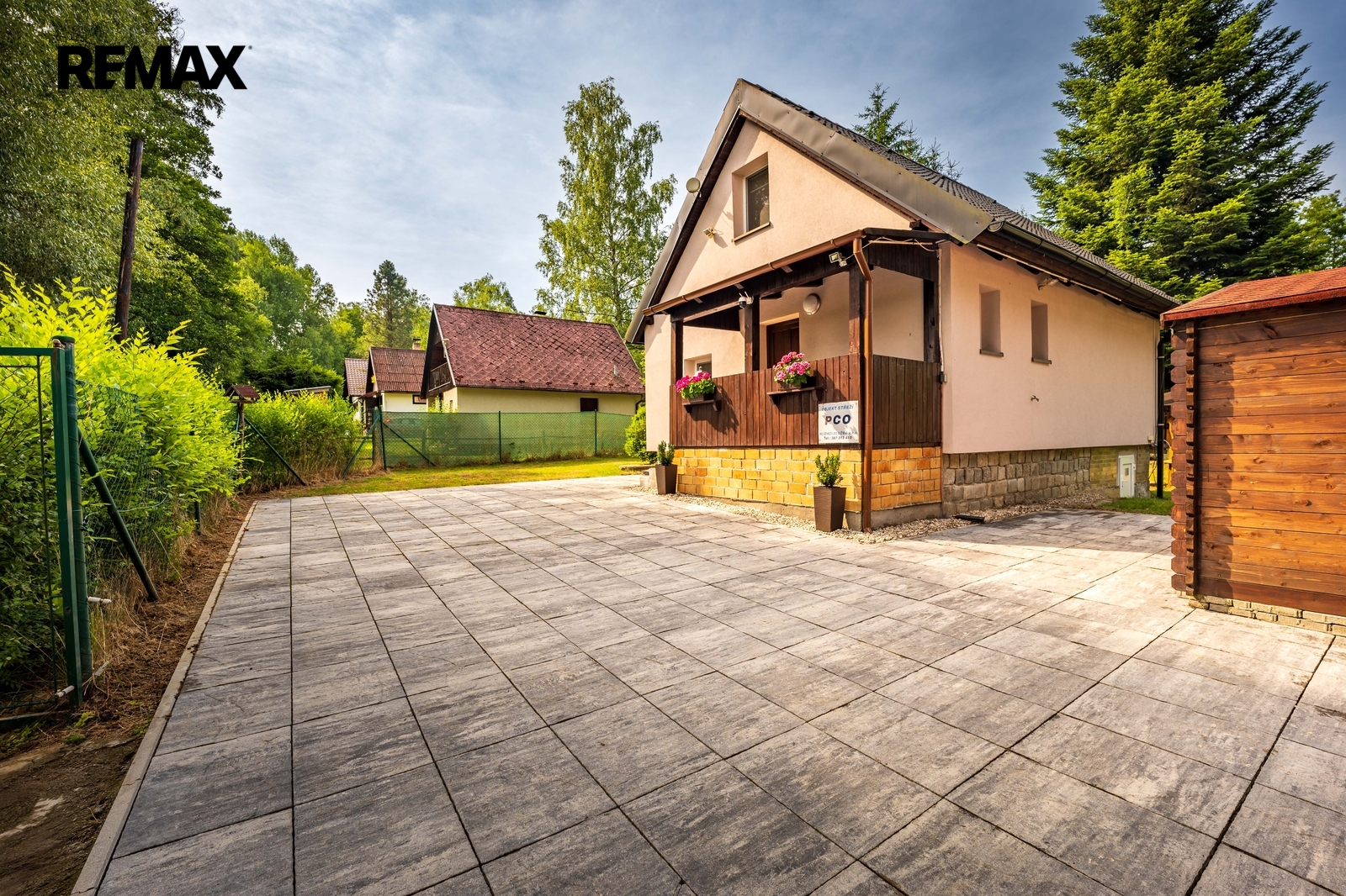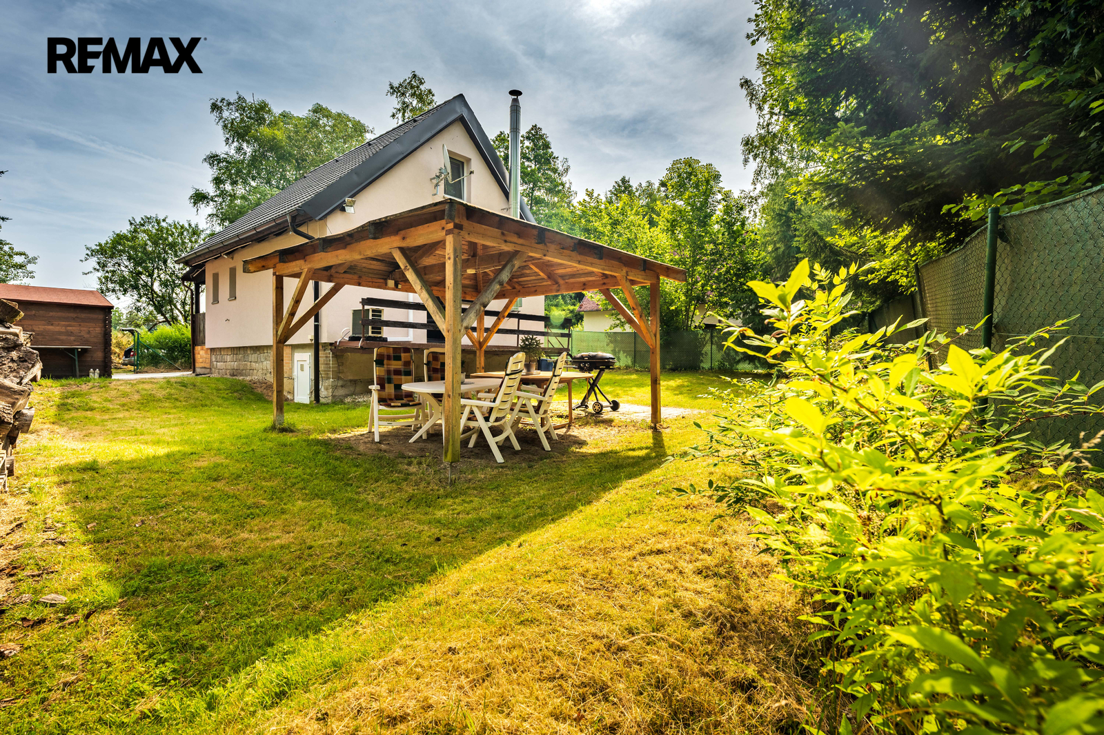 Součástí nemovitosti je pergola, dřevěný přístřešek na uskladnění např. zahradního nábytku a vydlážděné parkovací stání. Příjezd je po obecní komunikaci.