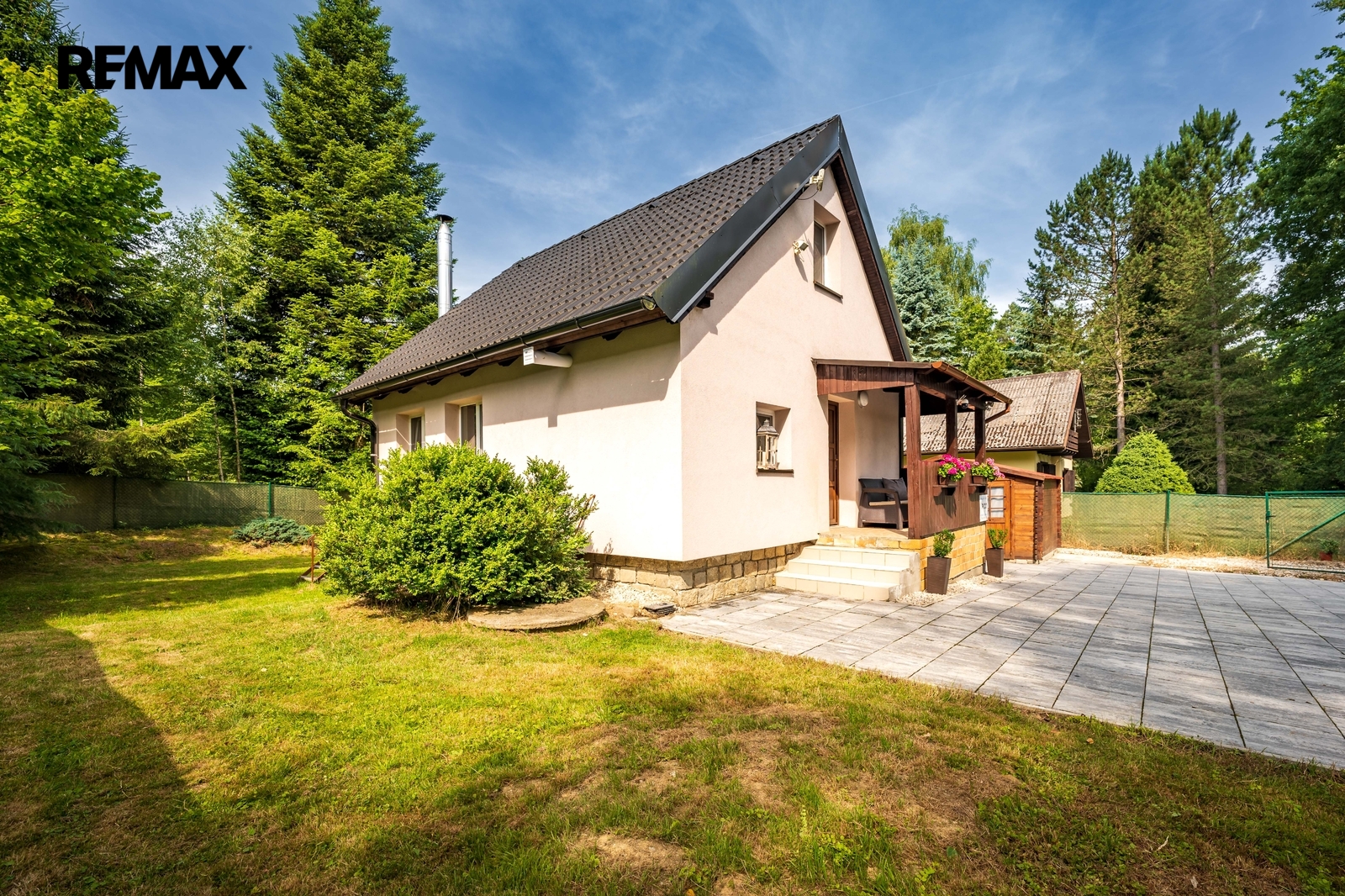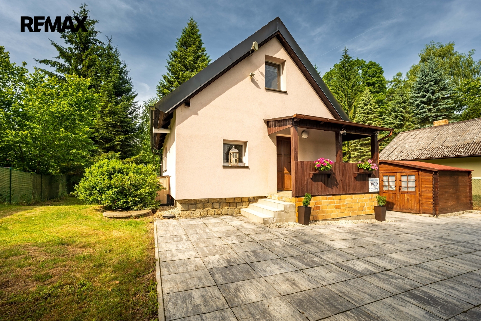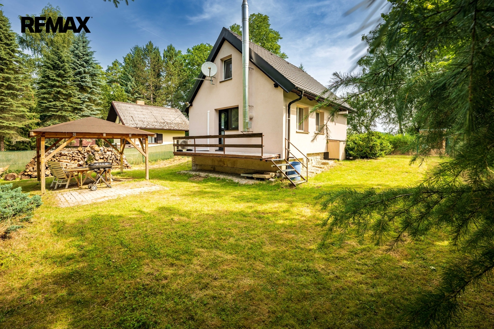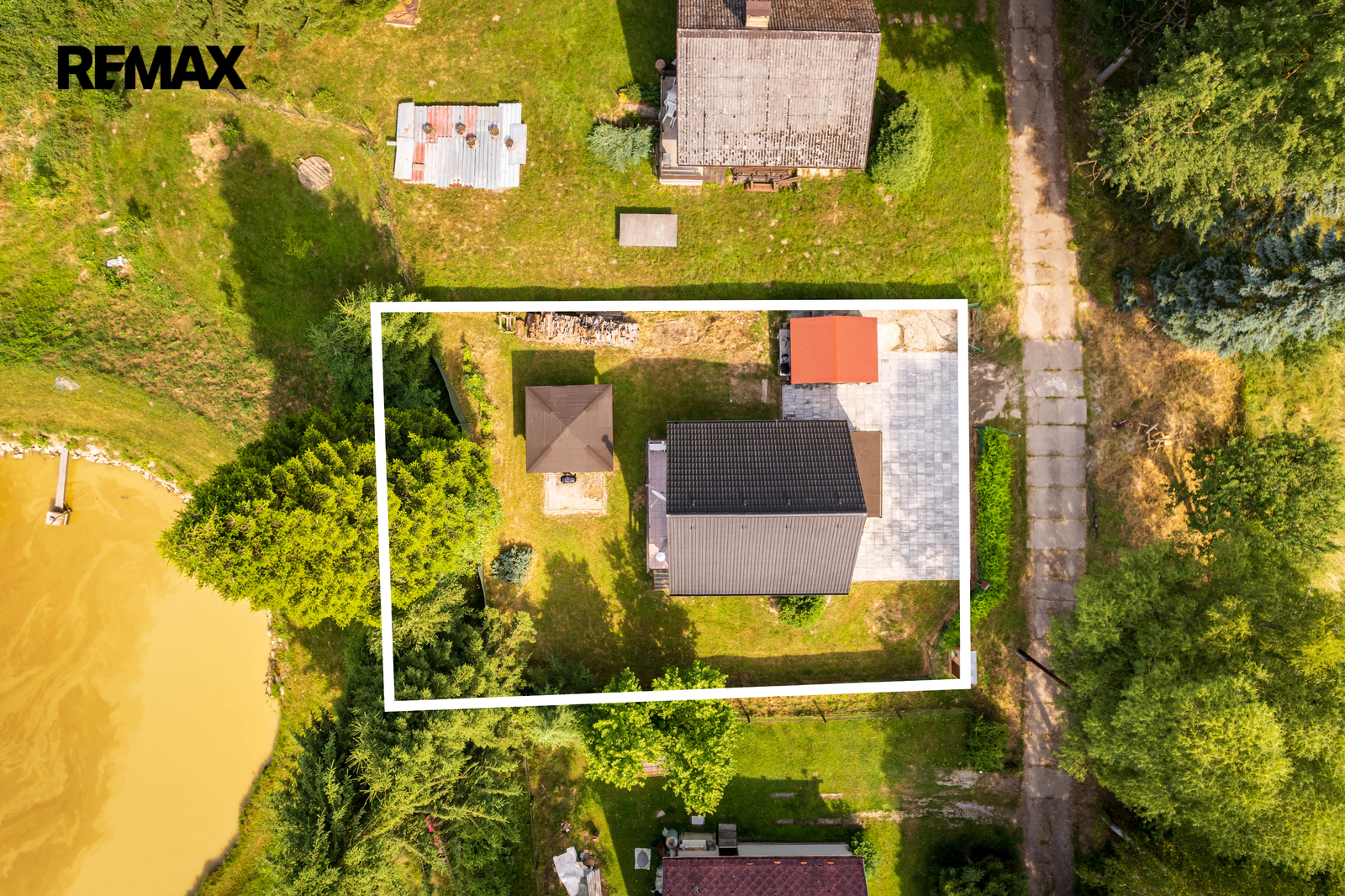 Součástí nemovitosti je pergola, dřevěný přístřešek na uskladnění např. zahradního nábytku a vydlážděné parkovací stání. Příjezd je po obecní komunikaci.