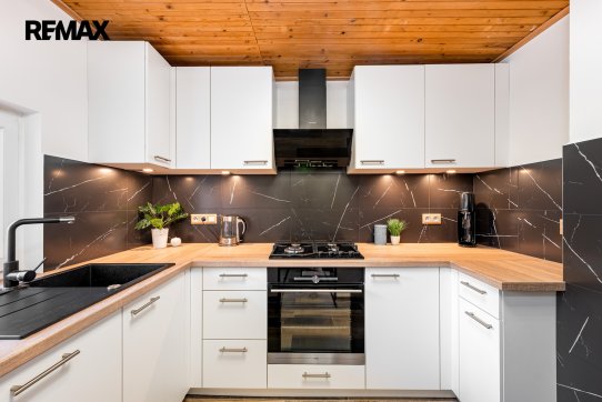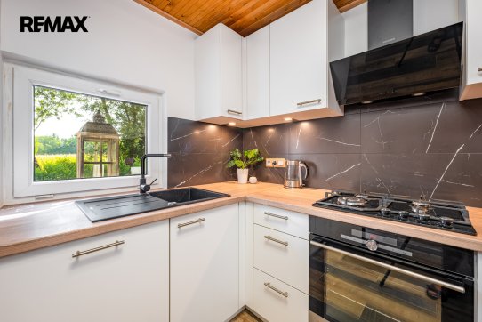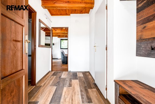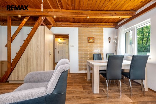 Obytná část: v prvním podlaží se nachází předsíň, hlavní obytná místnost s jídelním koutem, koupelna se sprchovým koutem a WC a samostatná kuchyně. Schodištěm je přístup do podkroví se dvěma ložnicemi. Prodává se vybavený kuchyňskou linkou se spotřebiči (trouba, plynová varná deska, digestoř, myčka nádobí). Podlahové krytiny jsou kombinací dlažby a PVC. Orientační dispozici obytné části s rozměry jednotlivých místností najdete na přiloženém půdorysu.