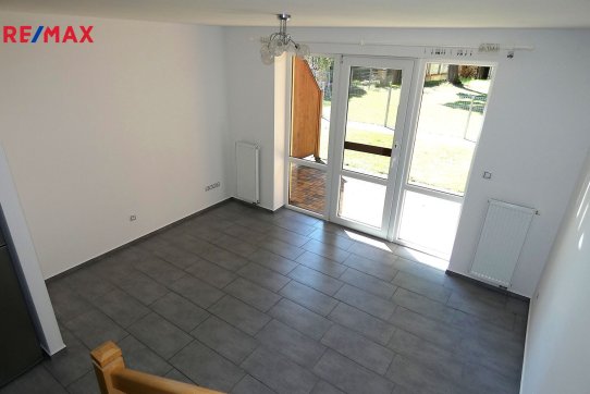 V přízemí se vstupuje do předsíně, dále technická místnost, samostatné WC s umyvadlem a velký obývací pokoj s kuchyňským koutem (kuch. linka, lednice s mrazákem, el. trouba, sklokeramická varná deska, myčka, digestoř) a vstupem na terasu.