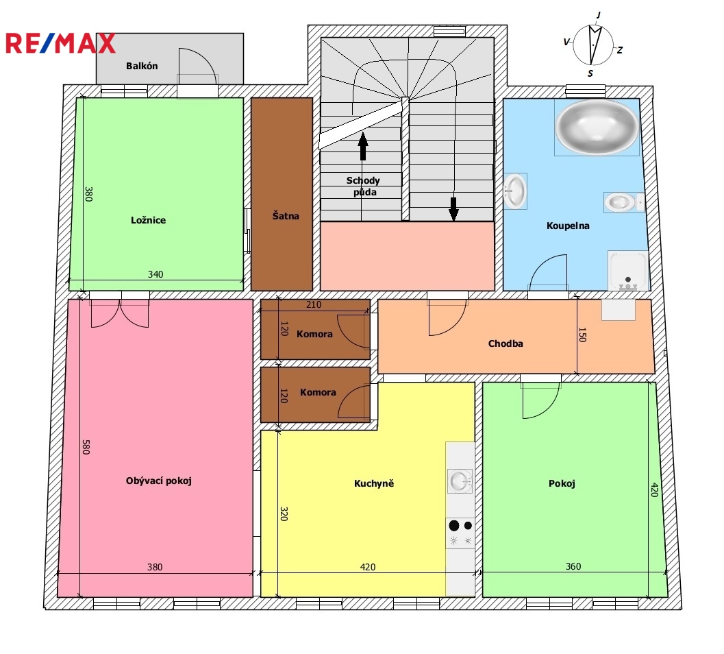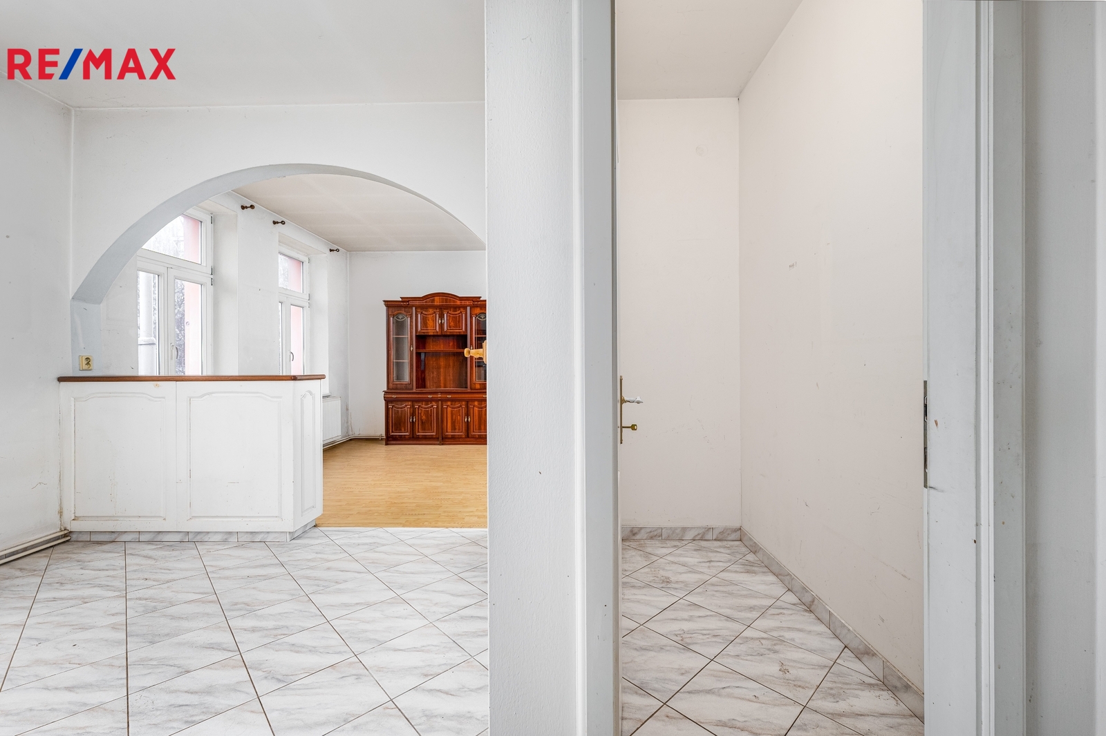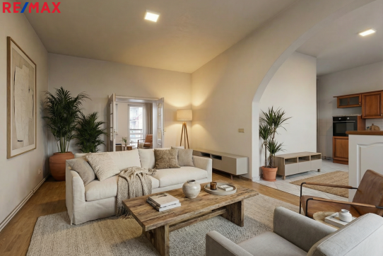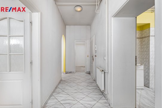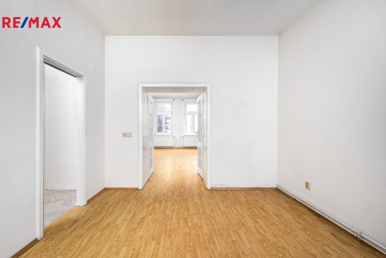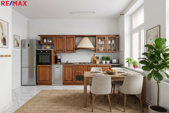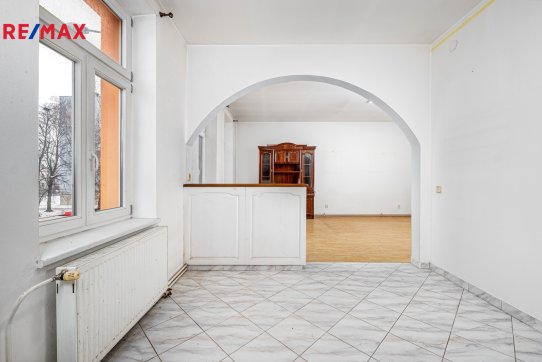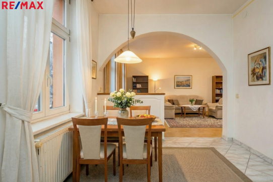 V patře domu se nachází bytová jednotka o dispozici 3+kk, 121 m2, která je vyklizená a nezařízená, připravená k okamžitému využití či úpravám dle potřeb nového majitele. Dominantou bytu je prostorný obývací prostor propojený s kuchyní a jídelnou. Byt dále nabízí ložnici se vstupem na balkon, další samostatný pokoj orientovaný do ulice, dvě komory a šatnu poskytující dostatek úložného prostoru. K dispozici je velká koupelna se sprchovým koutem, WC a rohovou vanou. Byt má vlastní vytápění pomocí kotle a samostatné měření.