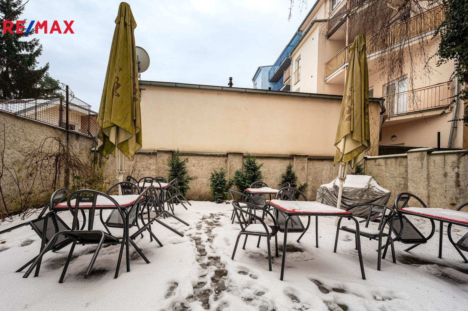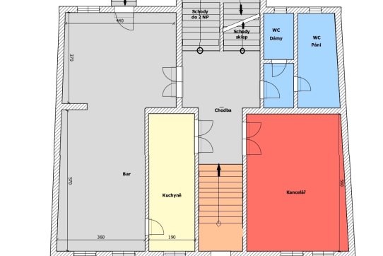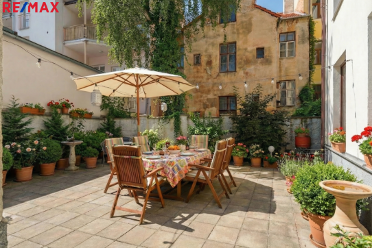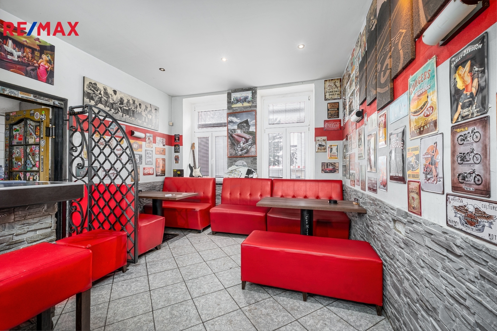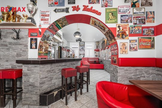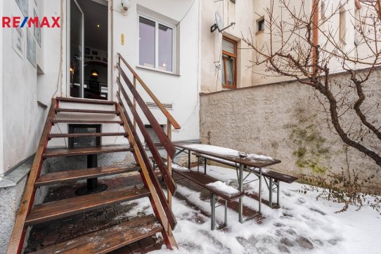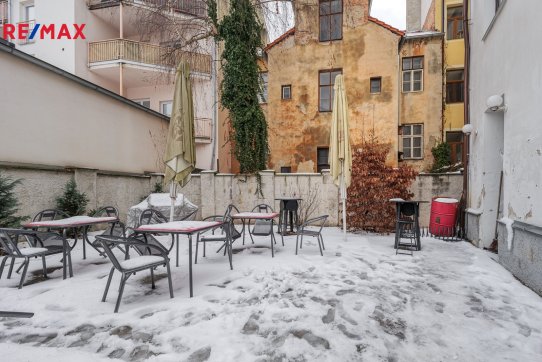 V přízemí domu je aktuálně provozovaný bar 25 m2 s menším zázemím - kuchyní se zavedeným chodem, který disponuje vstupem na velký uzavřený dvůr. Ten dnes slouží jako venkovní posezení pro hosty, do budoucna se však nabízí možnost jeho přeměny na soukromou zahradu, klidný vnitroblok nebo reprezentativní dvorek pro jiný typ provozu.