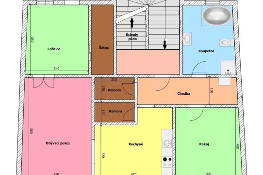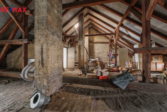 Dalším velkým benefitem je podkroví (půda) 121 m2, které je v současnosti využíváno jako úložný prostor, avšak nabízí výrazný potenciál k vestavbě dalších bytových jednotek, ateliéru či rozšíření obytné plochy.