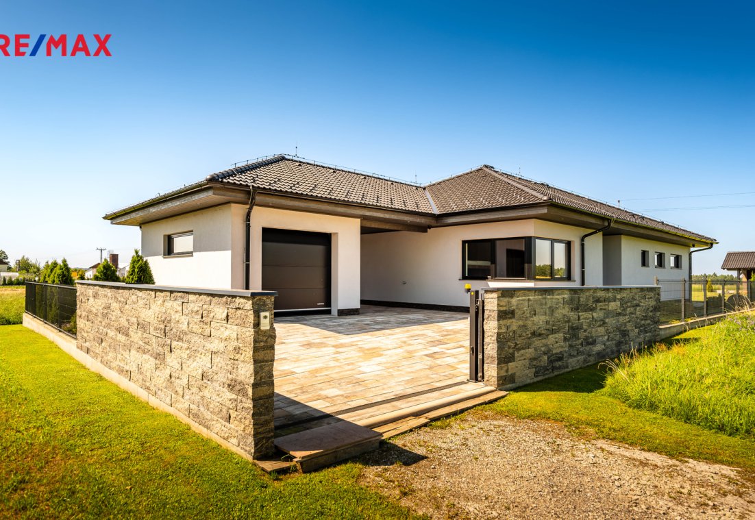 Součástí pozemku o celkové výměře 912 m2 je samostatný, nepodsklepený rodinný dům typu bungalov se samostatnou garáží se skladem o celkové zastavěné ploše 192 m2. Prostor mezi garáží a domem je zastřešen a vznikl zde tak prostor pro parkování dalšího vozu. Součástí nemovitosti je také zastřešená pergola umístěná v zadní části zahrady a krytý venkovní bazén navazující na vydlážděnou terasu obklopující celý dům.