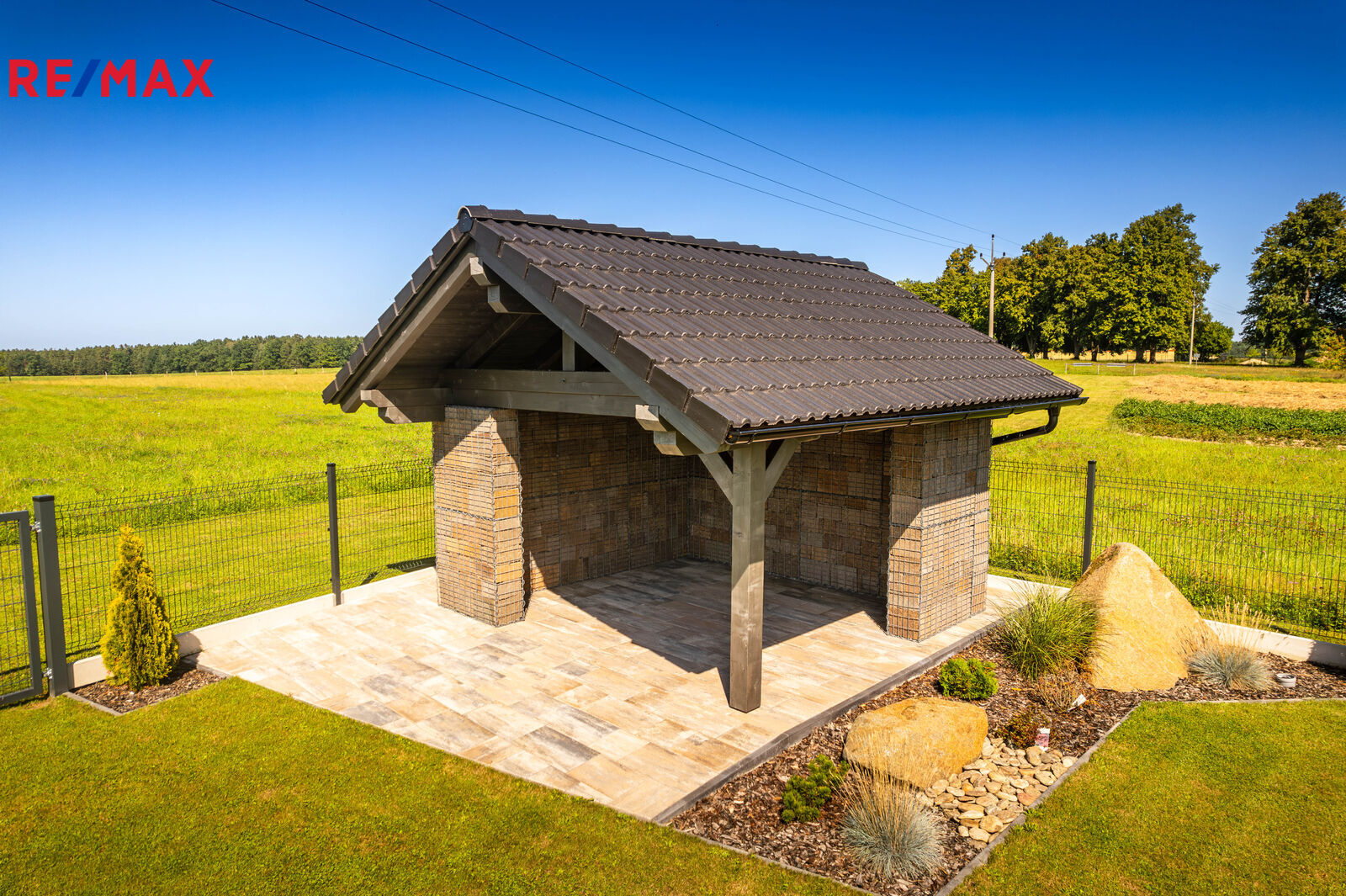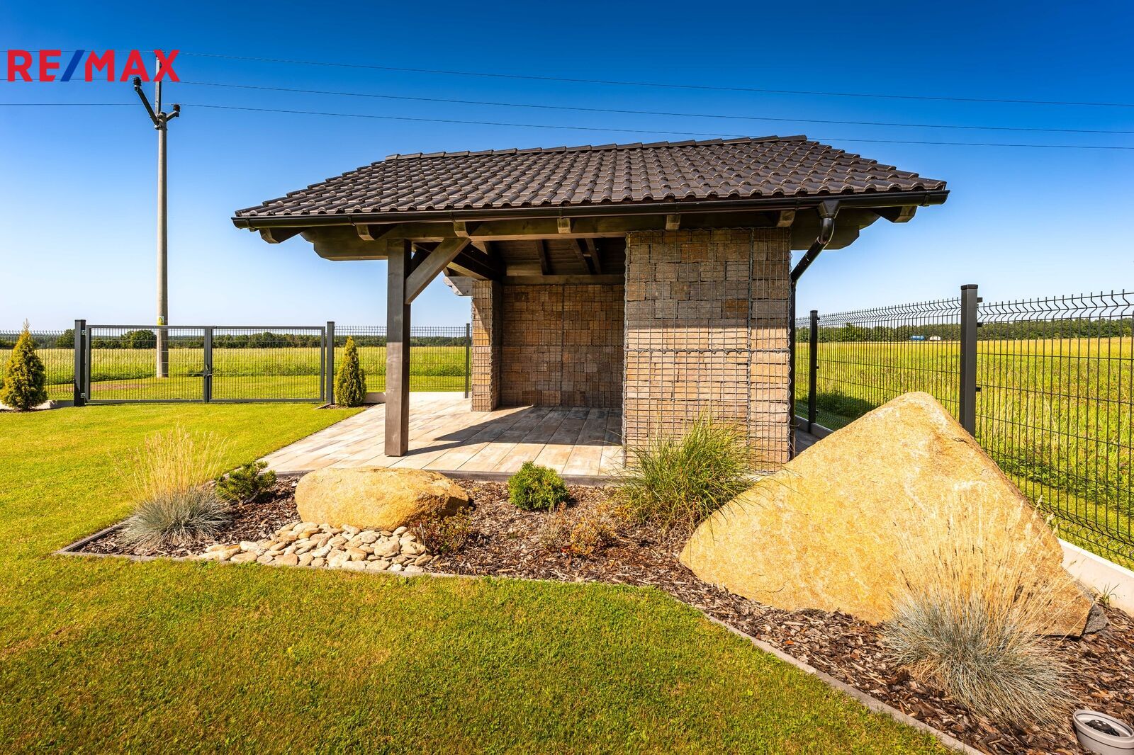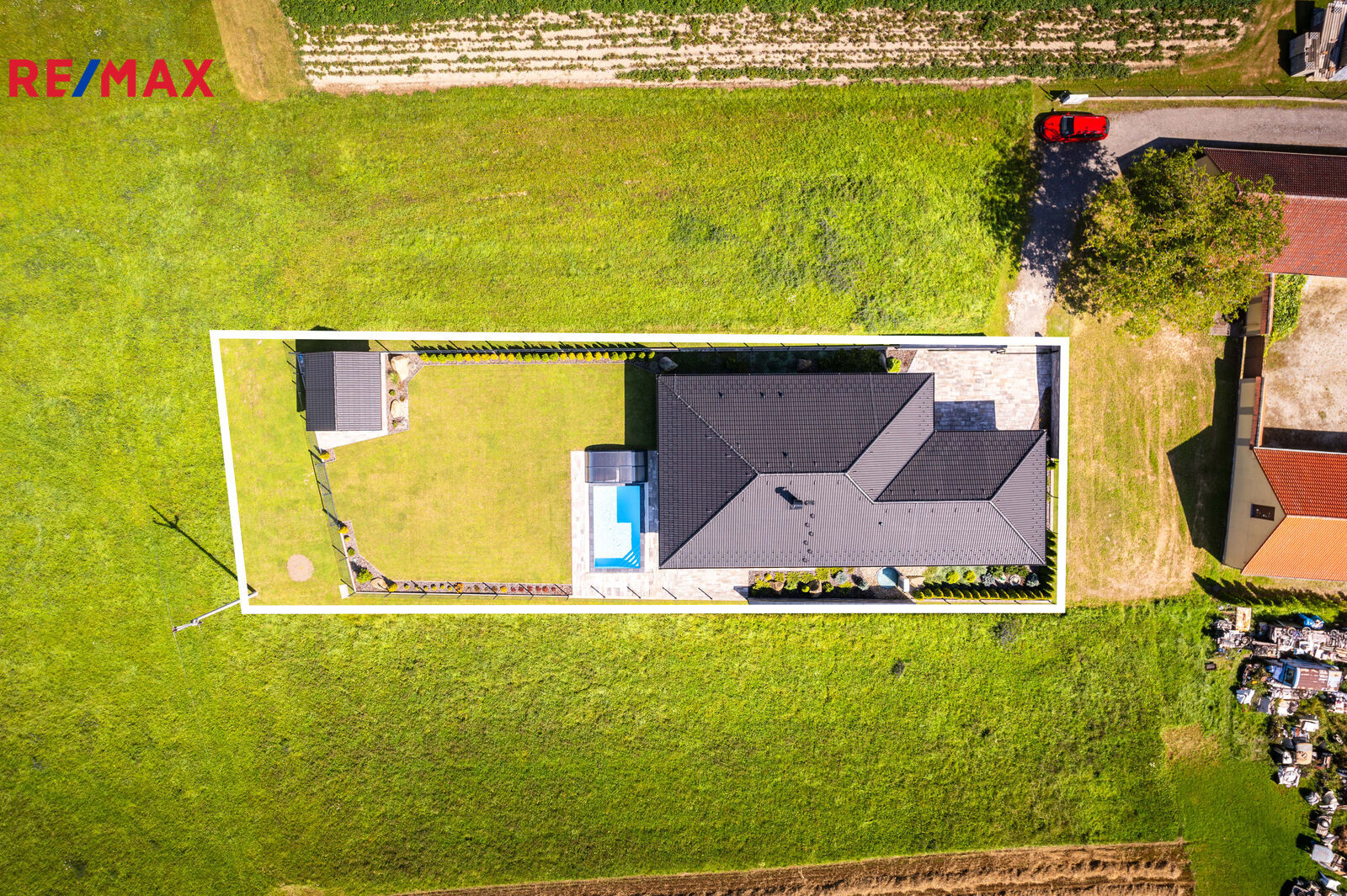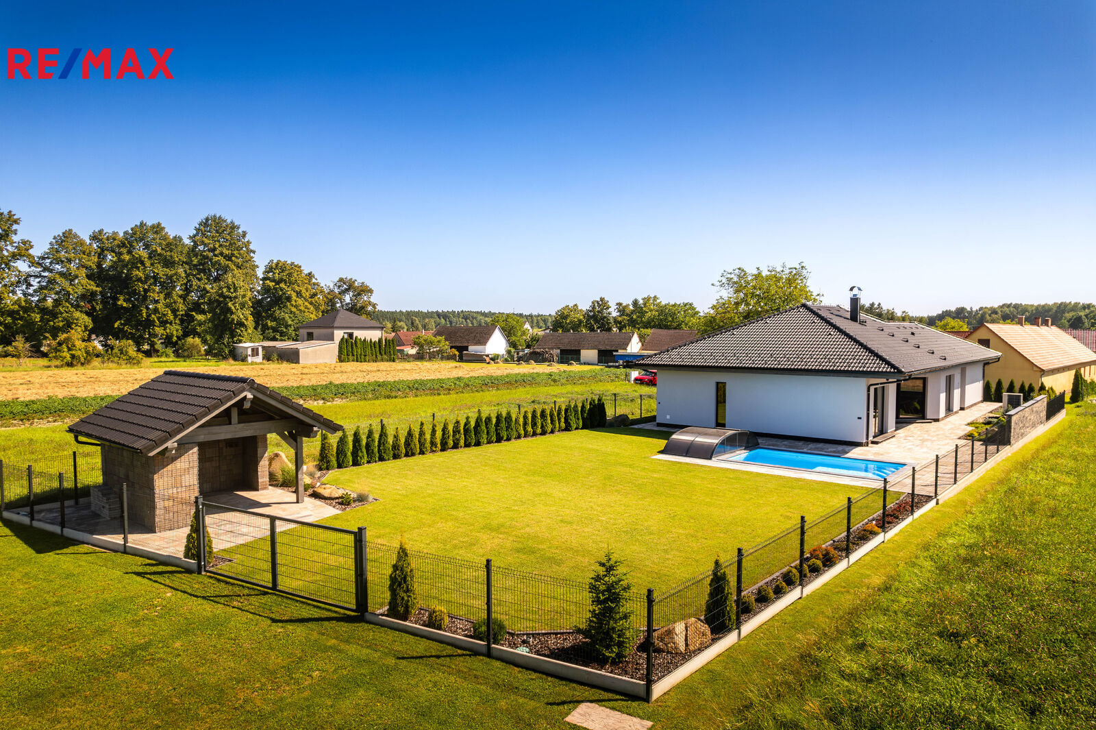 Pozemek je kompletně oplocen, přístup je po zpevněné cestě a vjezd bránou na el. pohon. Zahrada je osázená okrasnými dřevinami a součástí je zastřešený bazén (6 x 3,8 x 1,4 m).