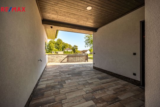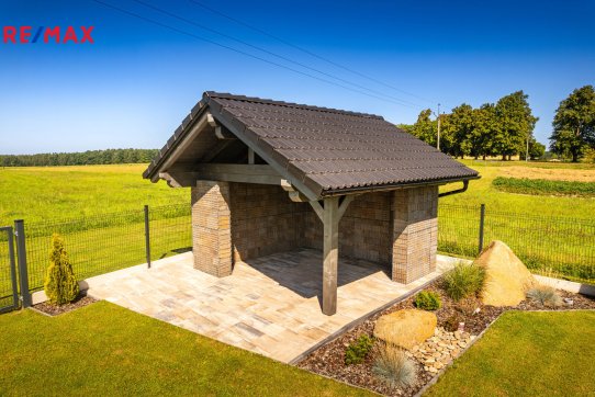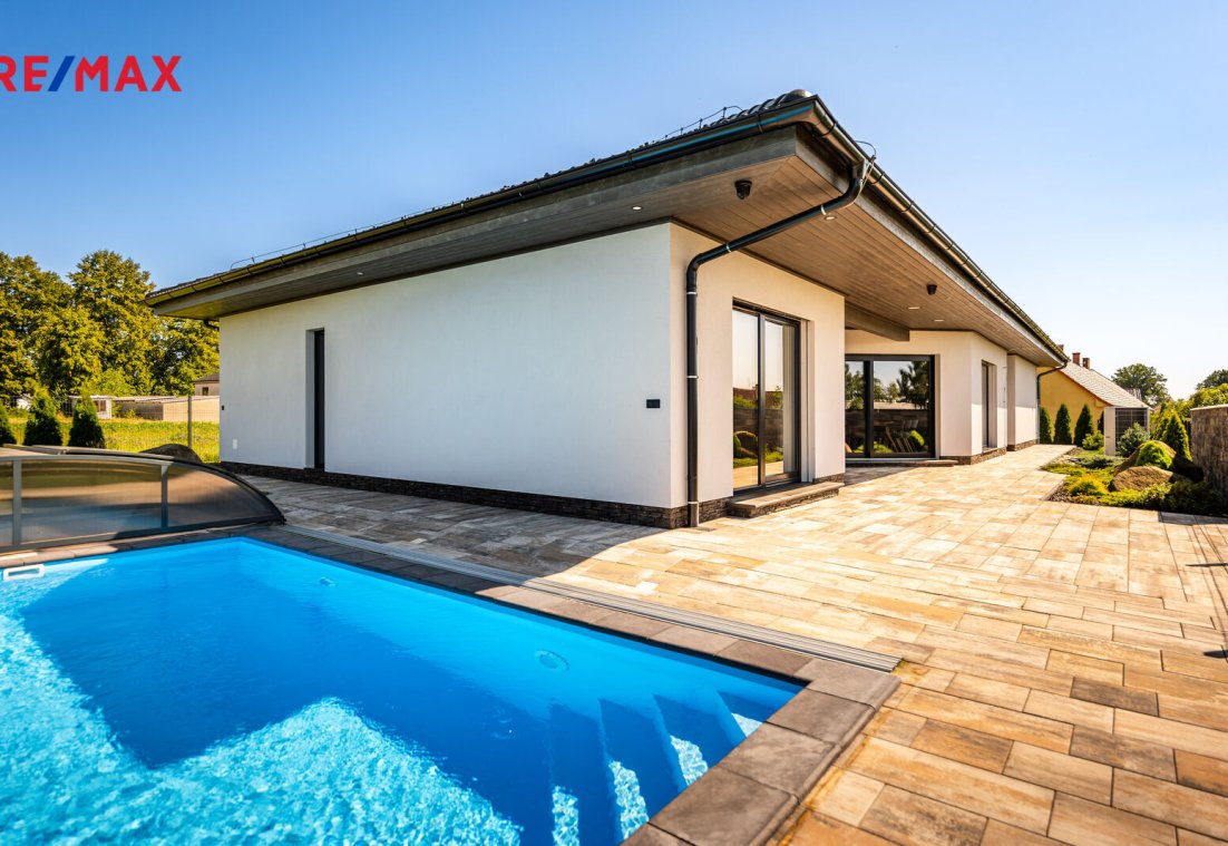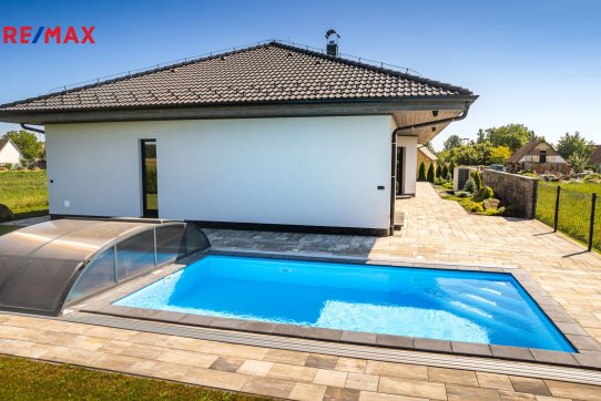 Součástí pozemku o celkové výměře 912 m2 je samostatný, nepodsklepený rodinný dům typu bungalov se samostatnou garáží se skladem o celkové zastavěné ploše 192 m2. Prostor mezi garáží a domem je zastřešen a vznikl zde tak prostor pro parkování dalšího vozu. Součástí nemovitosti je také zastřešená pergola umístěná v zadní části zahrady a krytý venkovní bazén navazující na vydlážděnou terasu obklopující celý dům.