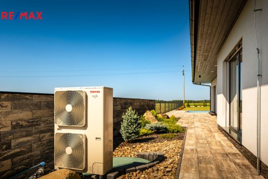 Na oknech v obývacím pokoji a ložnici jsou předokenní žaluzie, podlahové krytiny tvoří lepený vinyl a dlažba, dům má zabezpečovací systém. Postaven je z cihelných bloků Porotherm 44 cm, vybaven kvalitními dřevěnými dveřmi i okny (trojsklo). Vytápění je řešené ústředními, podlahovými rozvody, zdrojem je tepelné čerpadlo vzduch-voda. V obývacím pokoji jsou krbová kamna, která jsou obsluhována z technické místnosti. Ohřev vody zajišťuje 300 l kombinovaný bojler (tepelné čerpadlo a elektřina). Objekt je napojený na obecní přípojku vodovodního řadu, kanalizace je řešena vlastní čistírnou odpadních vod s přepadem do kanalizace. Dešťová voda je svedena do dvou retenčních nádrží, ze kterých je následně řešena závlaha zahrady.