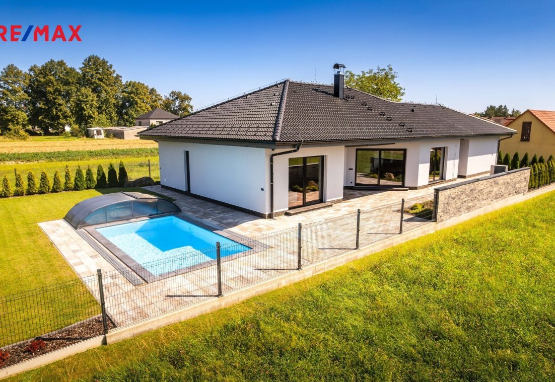 Součástí pozemku o celkové výměře 912 m2 je samostatný, nepodsklepený rodinný dům typu bungalov se samostatnou garáží se skladem o celkové zastavěné ploše 192 m2. Prostor mezi garáží a domem je zastřešen a vznikl zde tak prostor pro parkování dalšího vozu. Součástí nemovitosti je také zastřešená pergola umístěná v zadní části zahrady a krytý venkovní bazén navazující na vydlážděnou terasu obklopující celý dům.