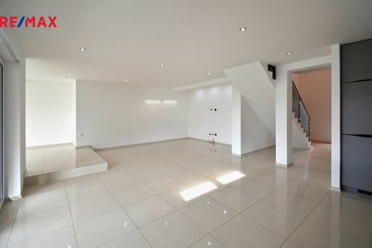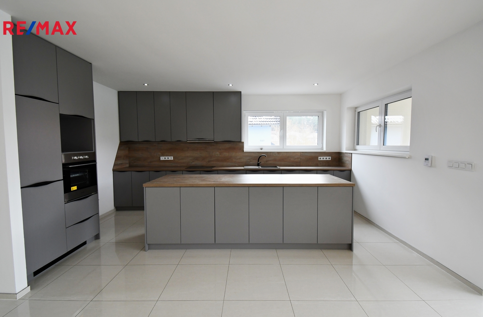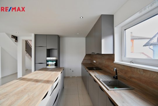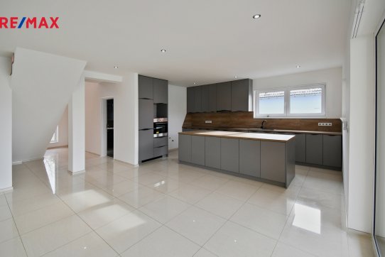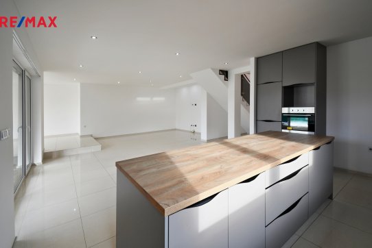 Přízemí je řešeno jako otevřený společenský prostor s přímým vstupem na terasu a zahradu. Dominantou je prostorná obytná část s obývacím pokojem propojeným s kuchyní, kde najdete zcela novou kuchyňskou linku s moderním ostrůvkem. Kuchyň je vybavena vestavnými spotřebiči – lednicí s mrazákem, myčkou, sklokeramickou troubou – a nabízí dostatek pracovní i úložné plochy. Na kuchyň plynule navazuje světlý prostor zimní zahrady / jídelny, který je díky oknům z více stran ideální jako jídelní kout, relaxační zóna nebo klidné místo na práci.