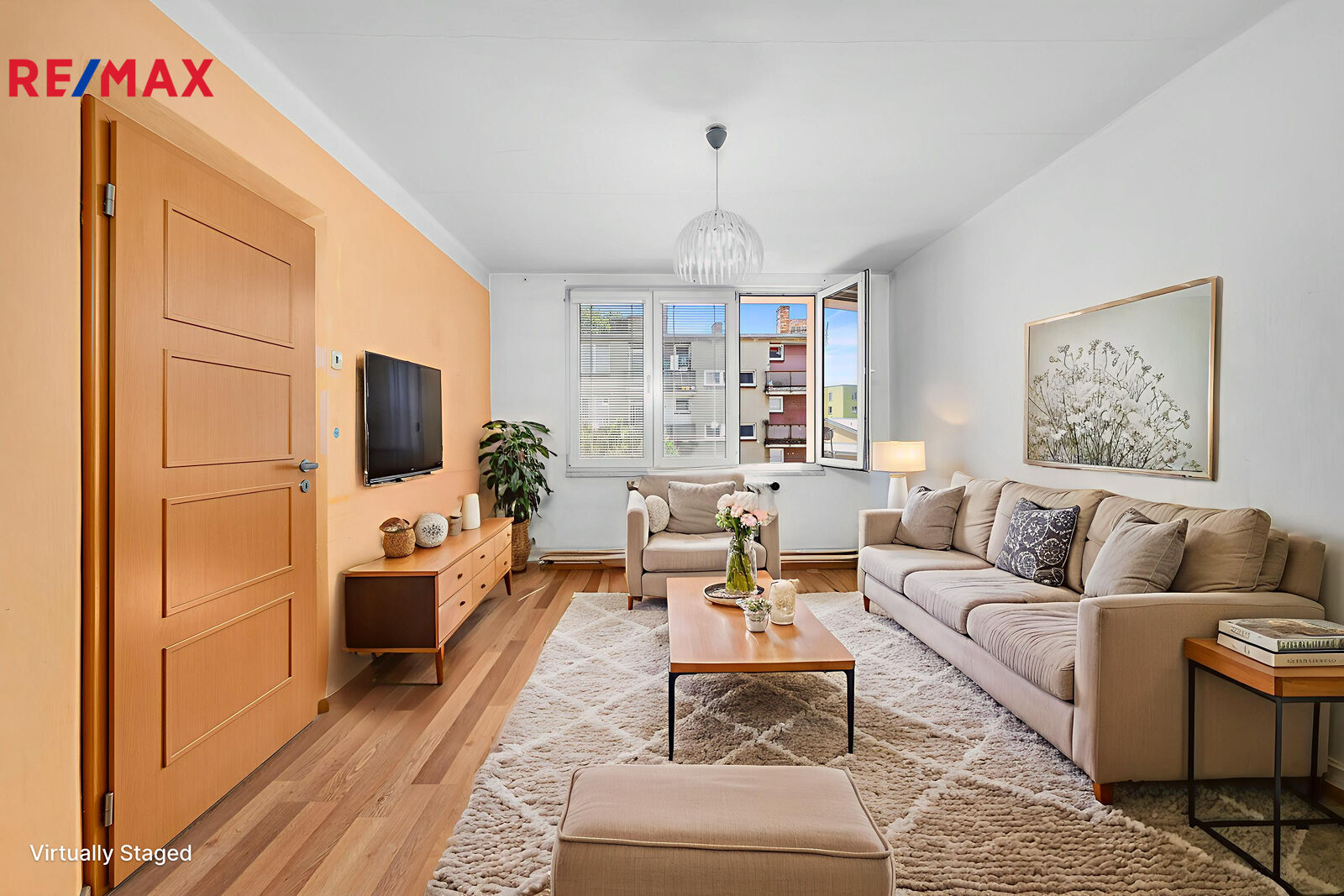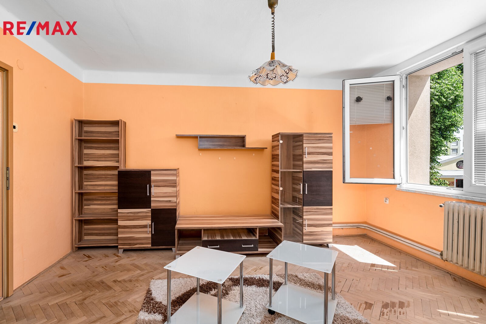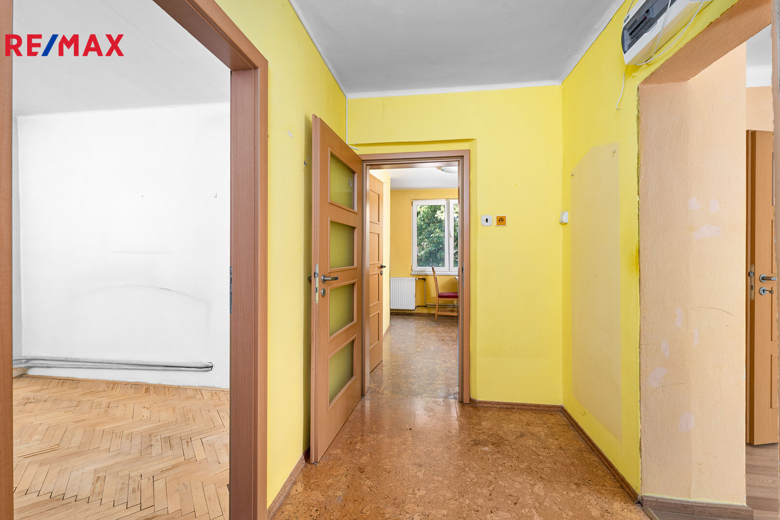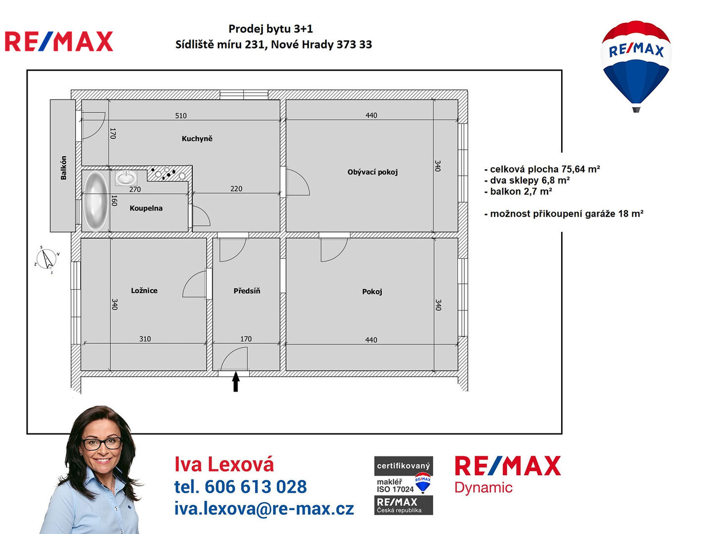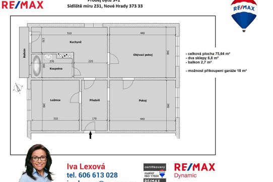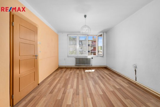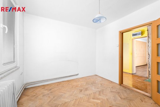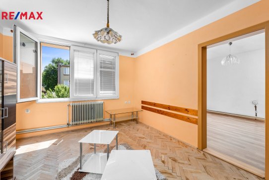 Byt s dispozicí 3+1 s celkovou plochou 75,64 m² (dva sklepy 6,8 m² a balkon 2,7 m²) se nachází ve 2. patře staršího, zděného domu bez výtahu.