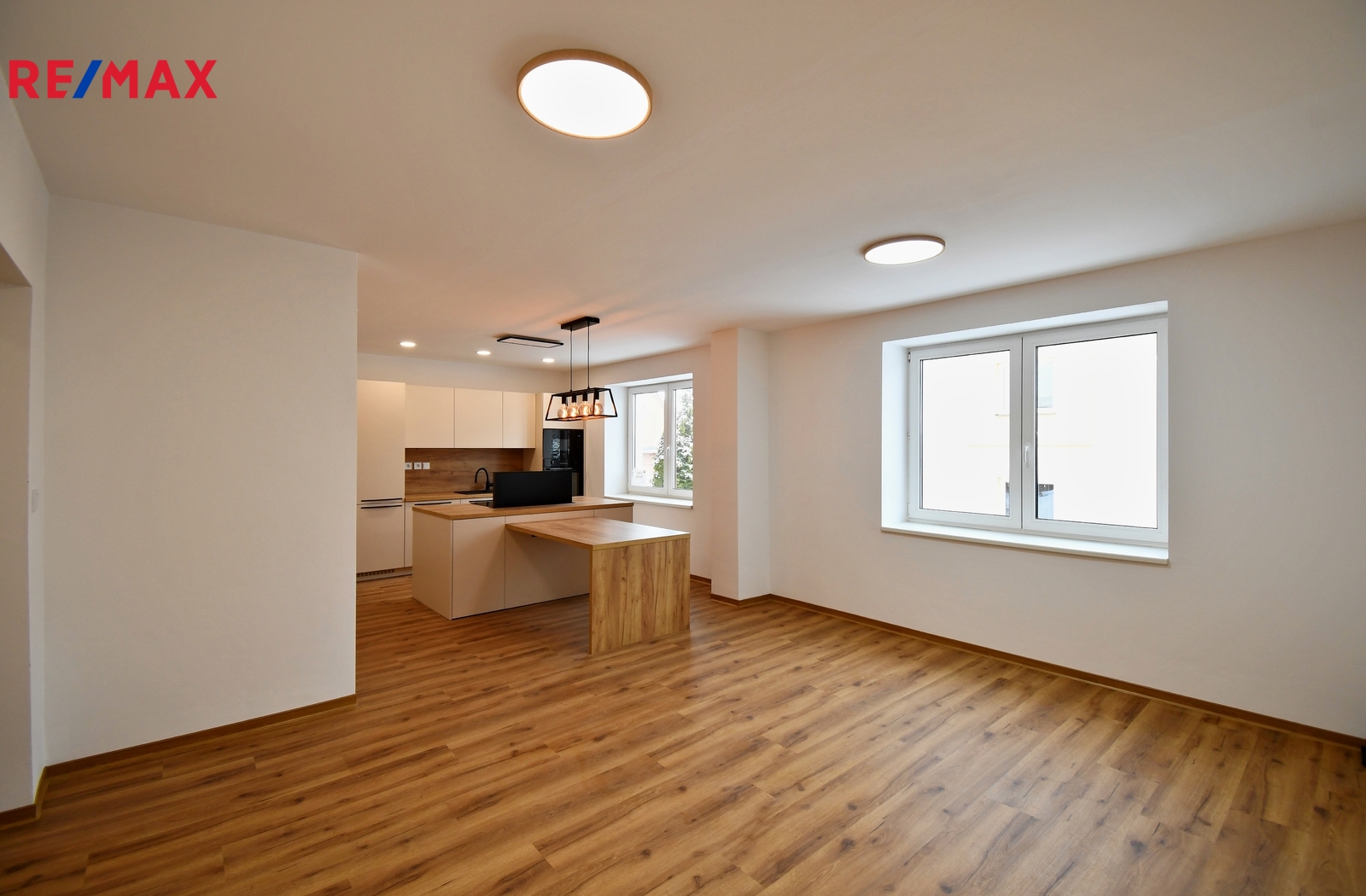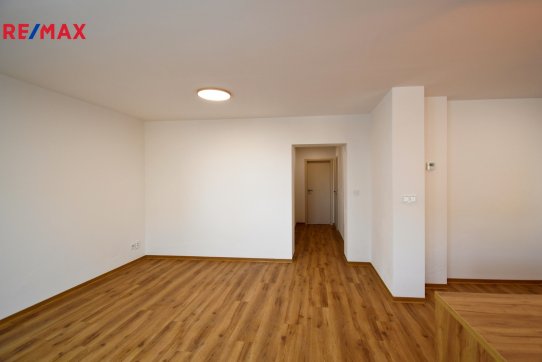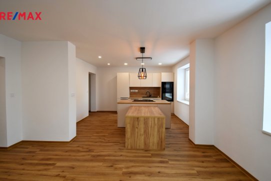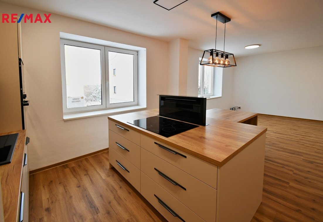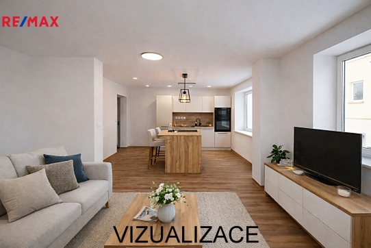 Dominantou bytu je prostorný obývací pokoj s moderní kuchyní a ostrůvkem. Kuchyň má čistý, nadčasový vzhled a je vybavená vestavnými spotřebiči. Praktickou třešničkou je elegantní výsuvný odsavač par, který se při používání vysune a po vypnutí zase nenápadně zmizí.
