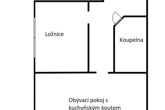 Dispoziční řešení - vstupní chodba, ložnice, obývací pokoj s kuchyňským koutem a zděná koupelna s WC.