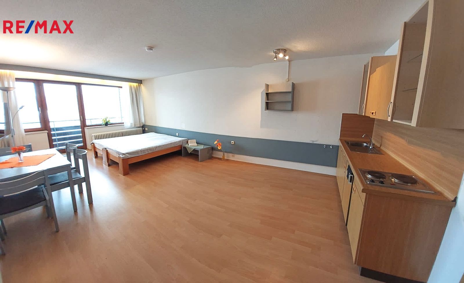 Kuchyňská linka, jídelní stůl + 4 židle, dvojpostel, šatní skříň v zádveří, sociální zařízení (WC, umyvadlo, sprchový kout).