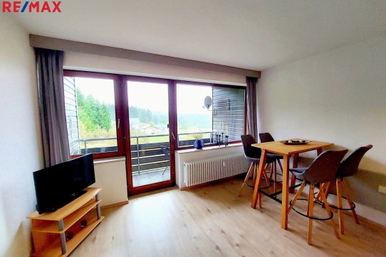 Exkluzivně nabízíme k prodeji apartmánový byt o dispozici 1+kk s výměrou 38m2 a garážové stání v příhraniční obci Haidmühle na německé straně Šumavy.