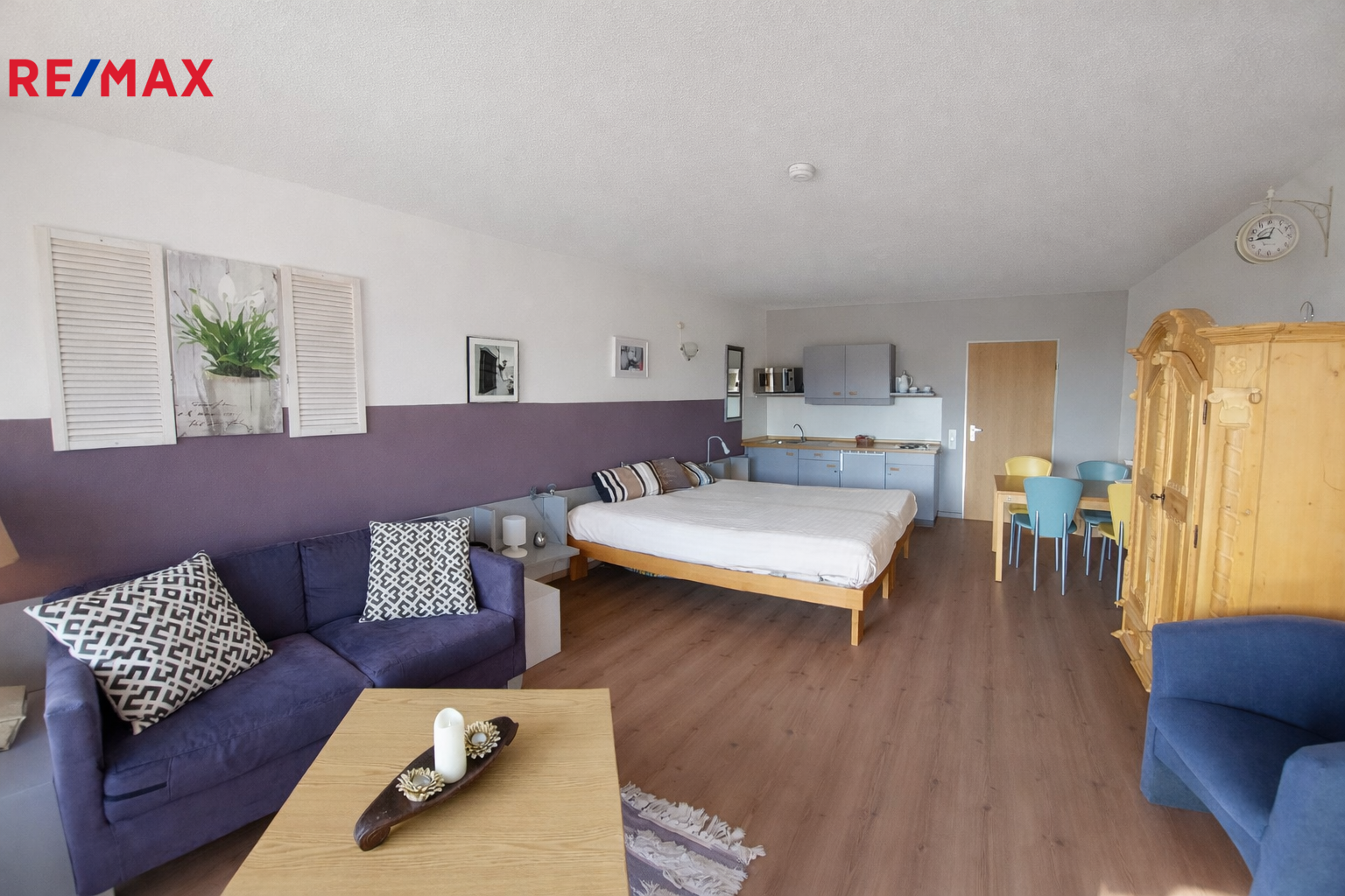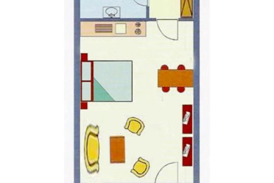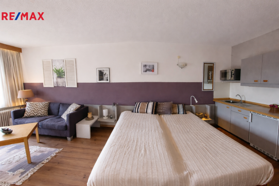 Byt se nachází ve II.NP budovy s výtahem. Apartmán je zařízený: kuchyňská linka, jídelní stůl + 4 židle, dvojpostel, pohovka, šatní skříň v zádveří, sociální zařízení (WC, umyvadlo, sprchový kout).