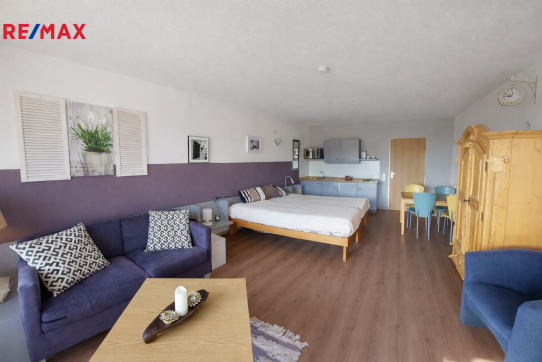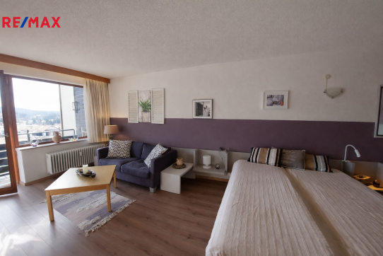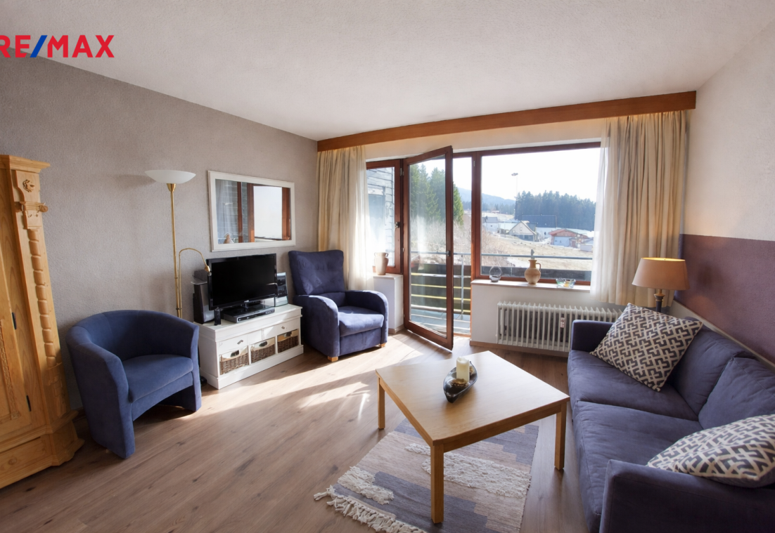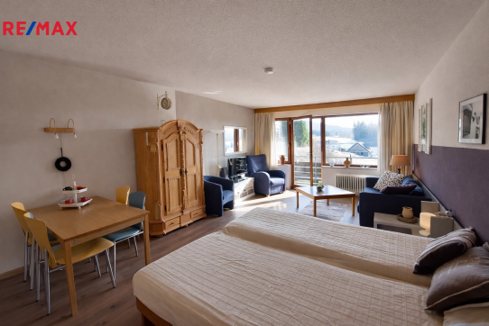 Exkluzivně nabízíme k prodeji apartmánový byt o dispozici 1+kk s výměrou 38m2 a garážové stání v příhraniční obci Haidmühle na německé straně Šumavy.