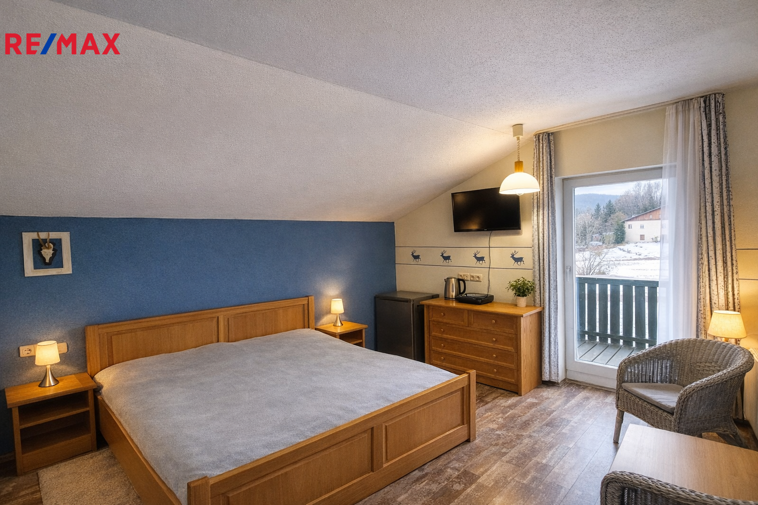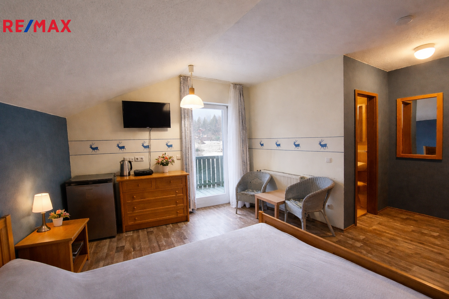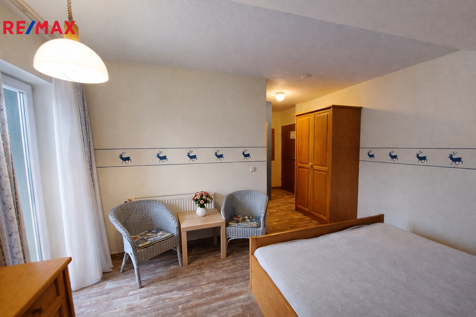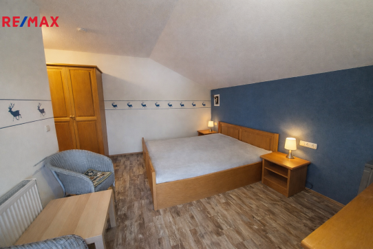 Apartmán je jednopokojový s příslušenstvím (koupelna s WC). V pokoji je manželská postel, dále je vybaven masivním bavorským nábytkem.