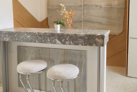 Jedná se o ojedinělý prostor s řadou atypických interiérových prvků, které potěší každého náročného kupujícího. Byt disponuje zajímavými výklenky i členěním. Prostornému obývacímu pokoji s krbem dominuje knihovna. Dvě samostatné prostorné ložnice jsou vkusně členěny na denní a noční odpočinkovou zónu. Pokoje disponují dostatečnými úložnými prostory. Kuchyňská linka umístěná pod oknem zajišťuje dostatek denního světla pro běžné denní činnosti. Barový pult odděluje jídelní kout, který disponuje jídelním stolem s vyhřívanou stolní kamennou deskou. Na stěně vedle jídelního koutu se nachází mramorový topný panel. Byt je velmi prostorný a prosluněný s dostatkem denního světla. Přírodní materiály použité v interiéru dodávají bytu neopakovatelnou atmosféru a unikátnost.