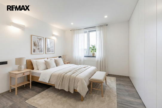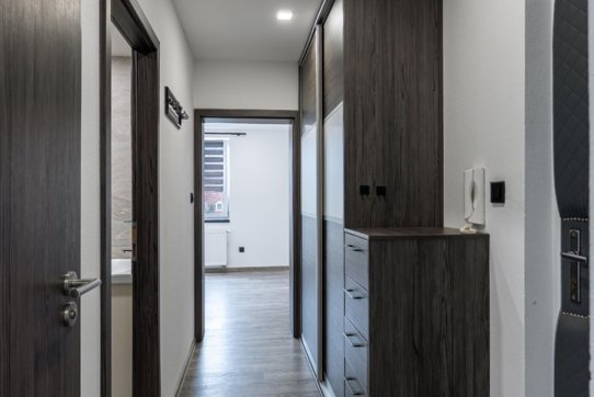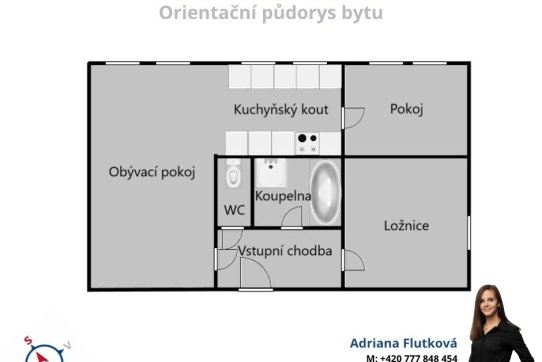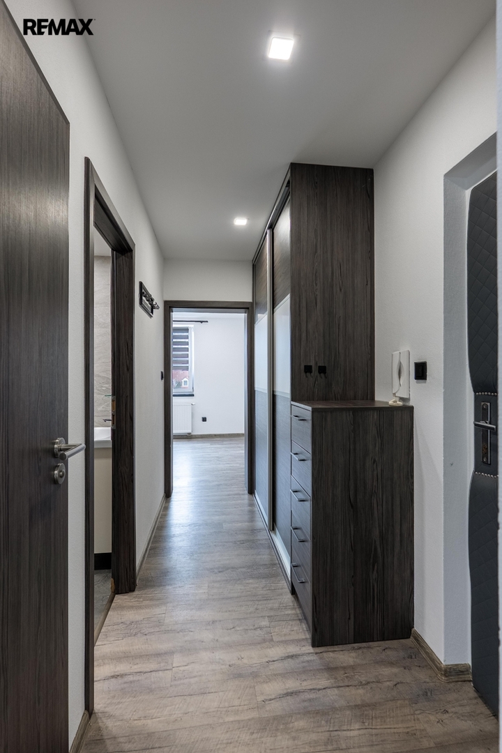 Dispozice bytu je prakticky řešená – ze vstupní chodby je přístup do koupelny a samostatného WC, dále do obývacího pokoje s kuchyňským koutem, který tvoří hlavní obytný prostor bytu. Z něj se vstupuje do dalšího pokoje. Samostatná ložnice je přístupná z chodby, což zajišťuje dostatek soukromí. Byt tak nabízí ideální rozdělení prostoru pro rodinné bydlení i práci z domova.