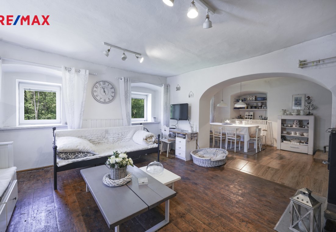 Ve výhradním zastoupení nabízíme k prodeji chalupu v obci Rožmitál na Šumavě se zahradou o celkové výměře 974 m2. Zastavěná plocha a nádvoří tvoří 585 m2, k tomu je souběžně k prodeji evidovaná zemědělská stavba se zastavěnou plochou 108 m2 a okolní pozemky 180 m2 a 101 m2. Tento samostatně stojící objekt typu smíšené stavby disponuje dvěma patry a nabízí celkem pět pokojů. Dispozičně 1. NP. obývací pokoj propojený s kuchyňským koutem a jídelnou, vstupní chodbou, samostatným WC. Dále sklepními prostory a dřevěným schodištěm vedoucí do 2. NP. kde se nachází 3 pokoje, spojovací větší chodba, kde je vytvořen odpočinkový kout s knihovnou, koupelna s vanou a WC. Celý půdní prostor je připravený pro případné rozšíření obytné části. Část domu je též podsklepena, kde je možnost vytvoření vinotéky nebo k uskladnění ovoce a zeleniny, či jen tak se ochladit v letních horkých dnech. Interiér domu je velmi vkusně zařízen s přihlédnutím k charakteru budovy. Na domě proběhla výměna oken a rekonstrukce koupelny, WC a drobných věcí. Dům je v dobrém stavu určen jak pro rodinné či rekreační bydlení. Krásné klidné místo, kde jistě každý najde čas k odpočinku a relaxaci. Uchvátí vás klidem, svou energií a polohou. Nad domem se nachází Torzo velké kaple Panny Marie Pomocné z r.1723 odkud je krásný výhled do krajiny. Napojeno na vodu z vrtané studny. Kanalizace řešena jímkou.