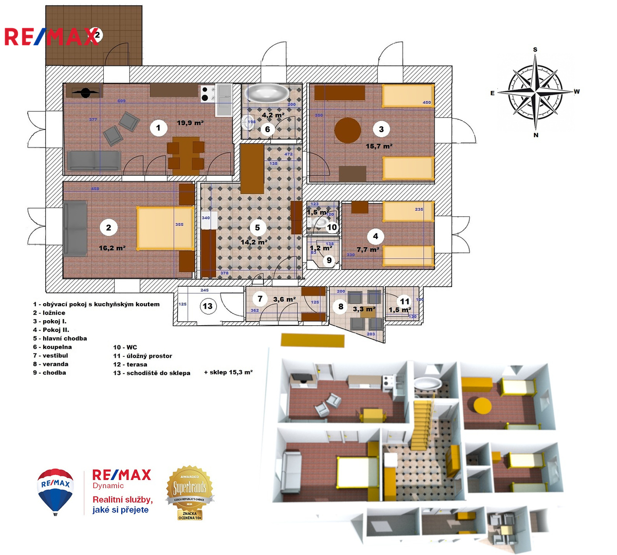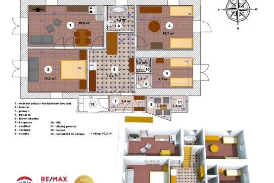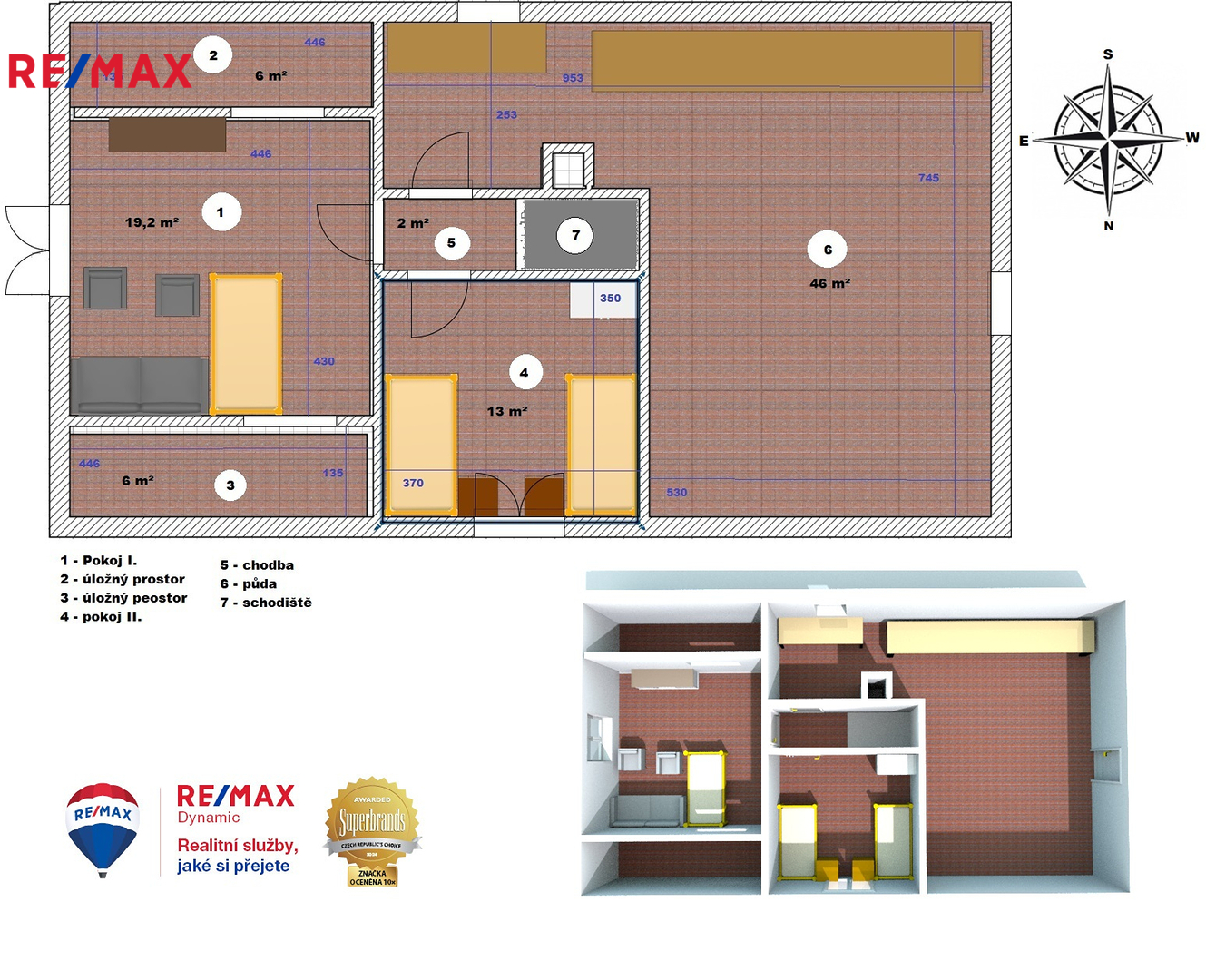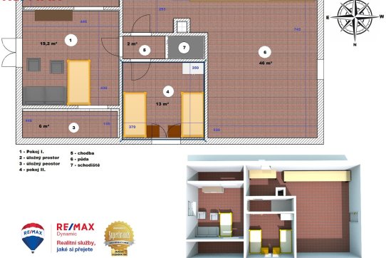 • Dispozice: 6+KK s možností rozšíření o další pokoje v půdním prostoru (dalších 46 m²).
