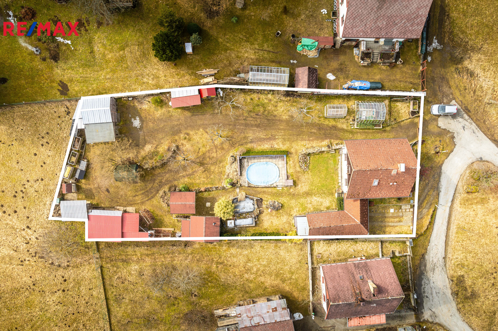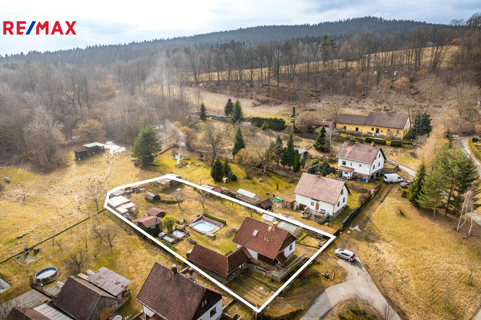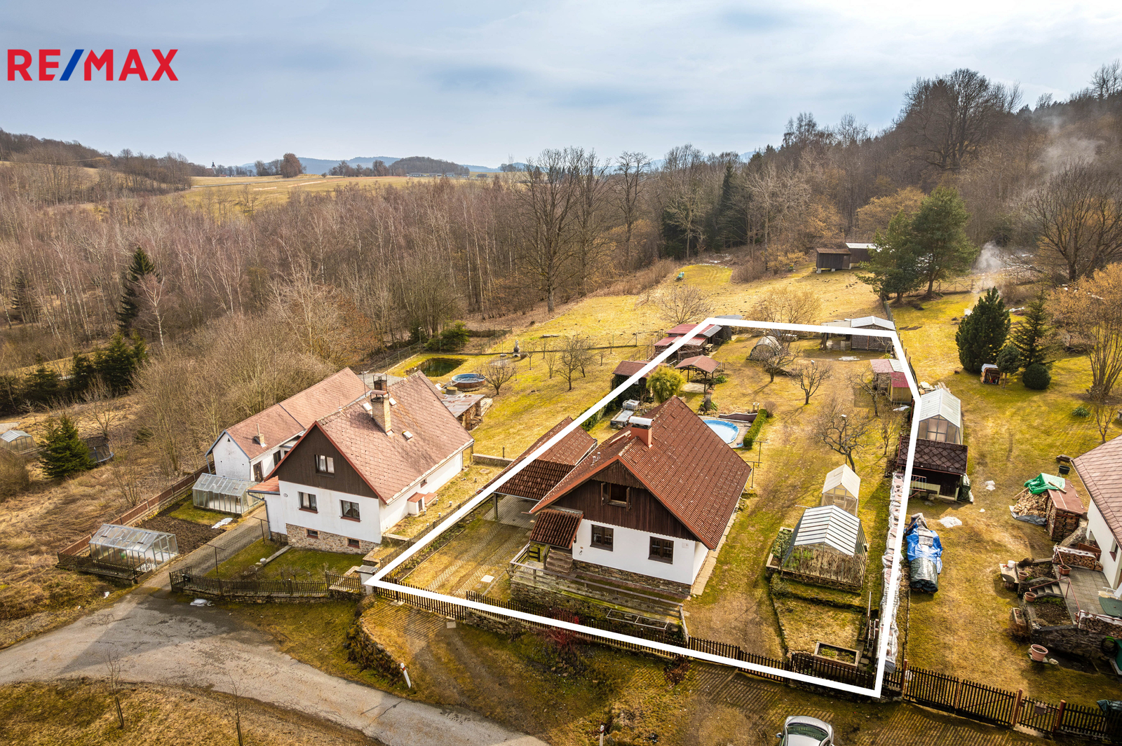 Na pozemku s celkovou plochou 1.376 m2 se nachází hlavní obytná stavba (kolaudována jako stavba pro rodinou rekreaci a cca 15 roků využívána pro trvalé bydlení) s vedlejšími a doplňkovými objekty, příslušenstvím a zařízením.