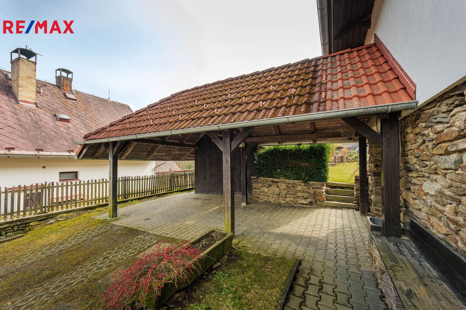 - samostatná garáž s navazujícím krytým parkovacím stáním a další zpevněnou plochou