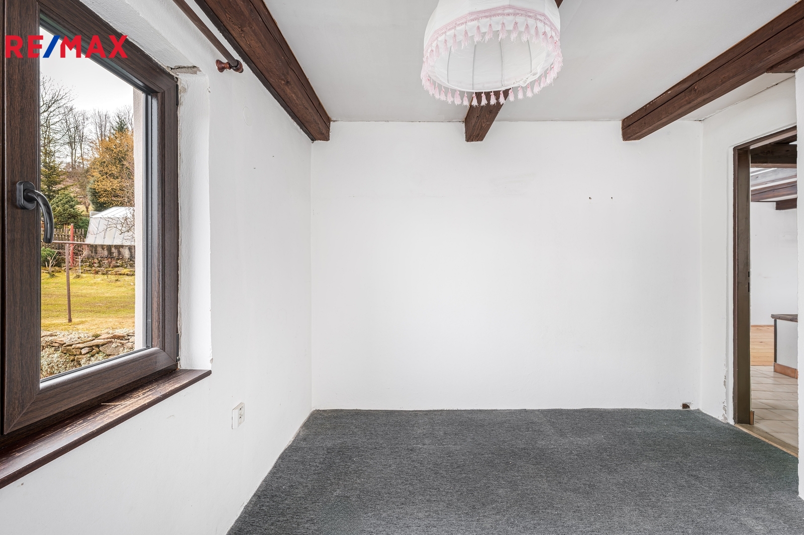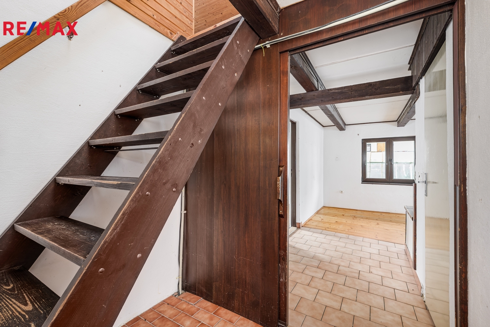 V podkroví (přístup po dřevěných schodech z hlavní chodby) se nalézá velký obytný prostor (8,7 x 5,7 m) s možností dílčího předělení a rozdělení.