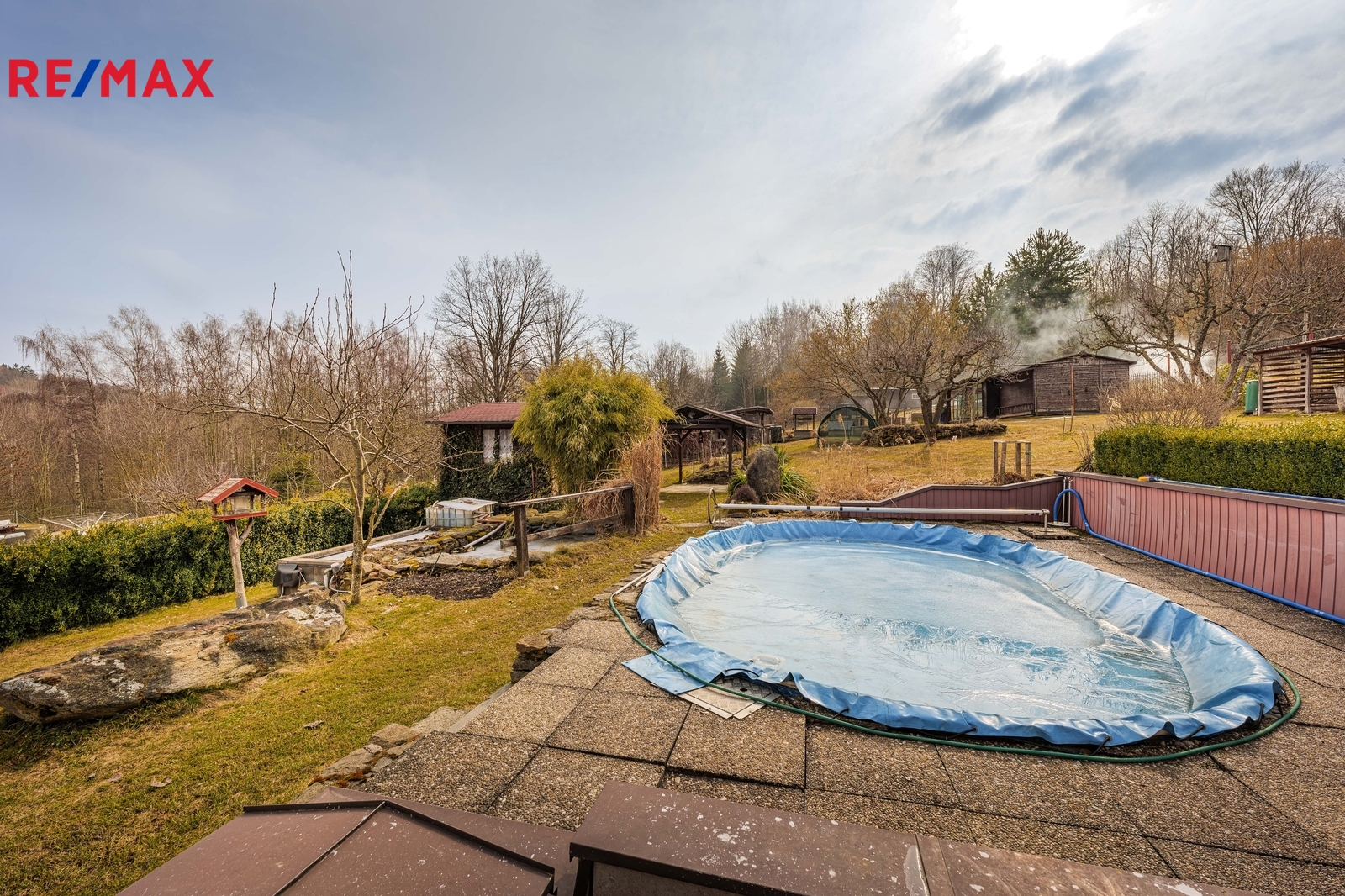 - dřevěný zahradní domek (venkovní kuchyně s posezením a grilem) s navazujícím zahradním altánem
