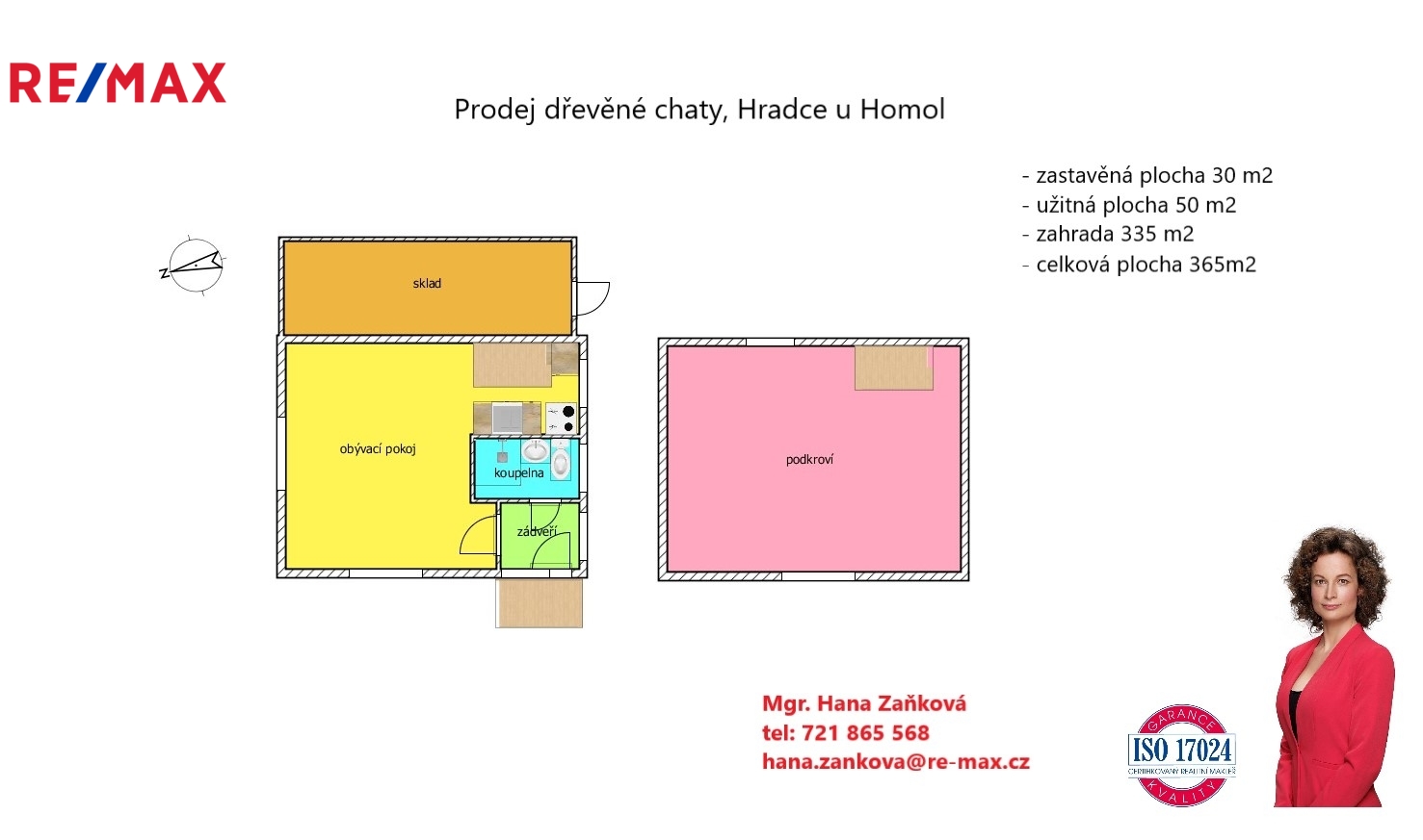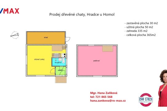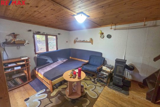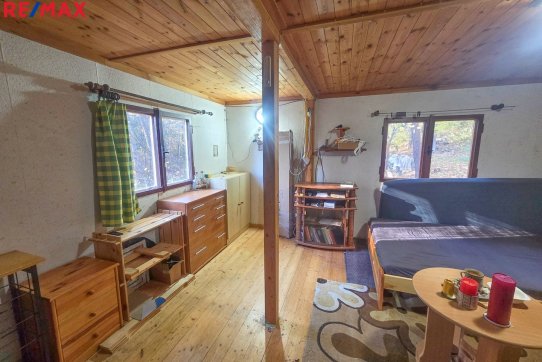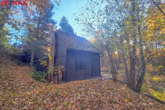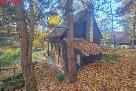 Chata o zastavěné ploše 30 m2 má dvě nadzemní patra a nachází se na samotném konci chatové oblasti.