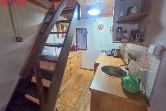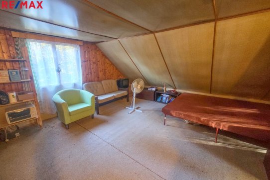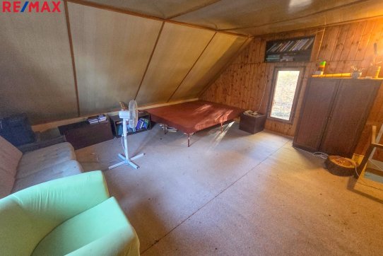 Do podkroví se vchází dřevěnými schody z obývacího pokoje. V podkroví se nachází pokoj (20 m2) s nízkou výškou.