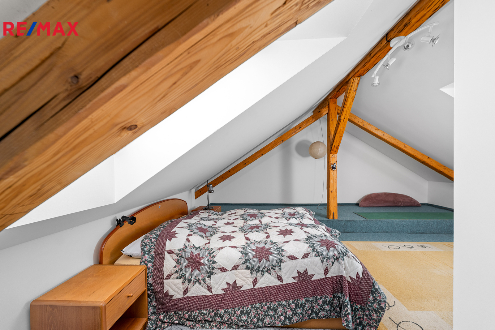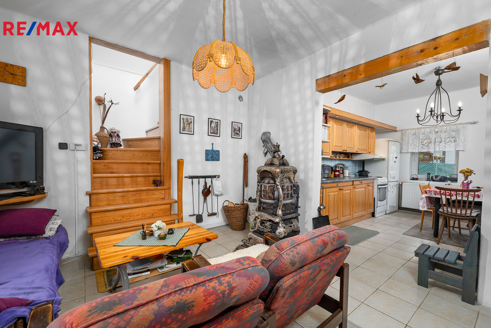 Dům se zastavěnou plochou cca 117 m2 je rozdělený na 2 části, obě se samostatnými vstupy. V pravé části objektu se nachází dvoupodlažní byt s dispozicí 3+1 a cca 92 m2 užitné plochy. Ten sestává v přízemí ze vstupní chodby, obývacího pokoje, kuchyně s kuchyňskou linkou a jídelní částí, koupelny s WC, chodby a komory (sklad, spíž). V podkroví jsou další 2 samostatné pokoje (25 a 30 m2), samostatné WC a podesta.