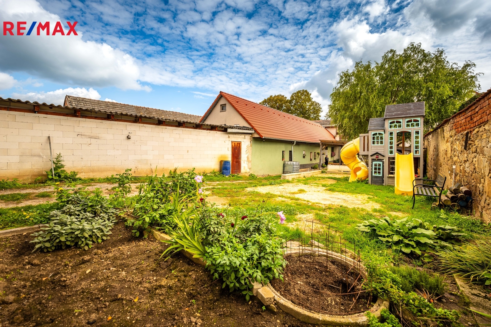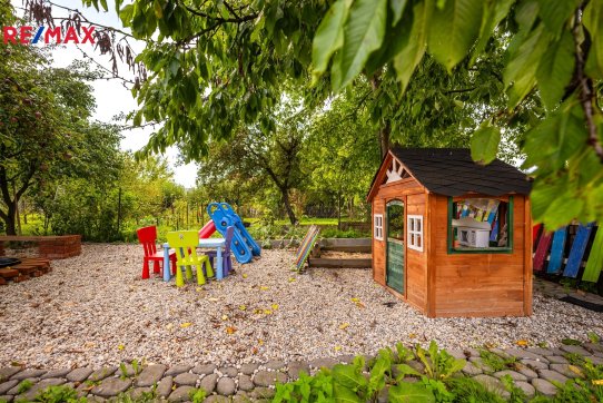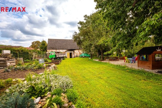Rozlehlý pozemek 1 531 m² nabízí velkou zahradu, pergolu, dílnu, sklad a parkování pro více vozidel.