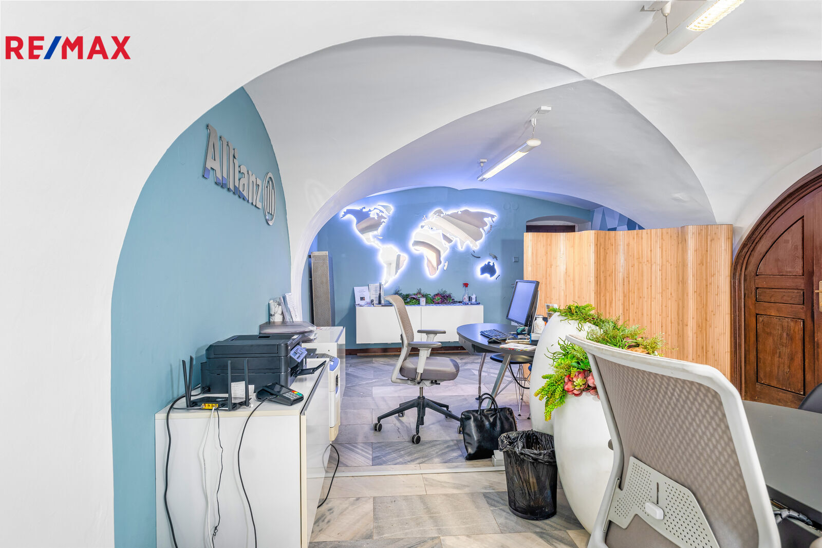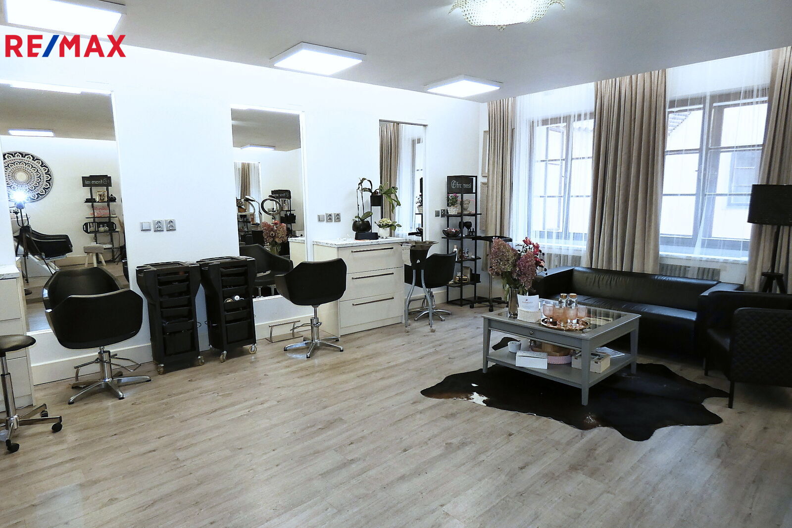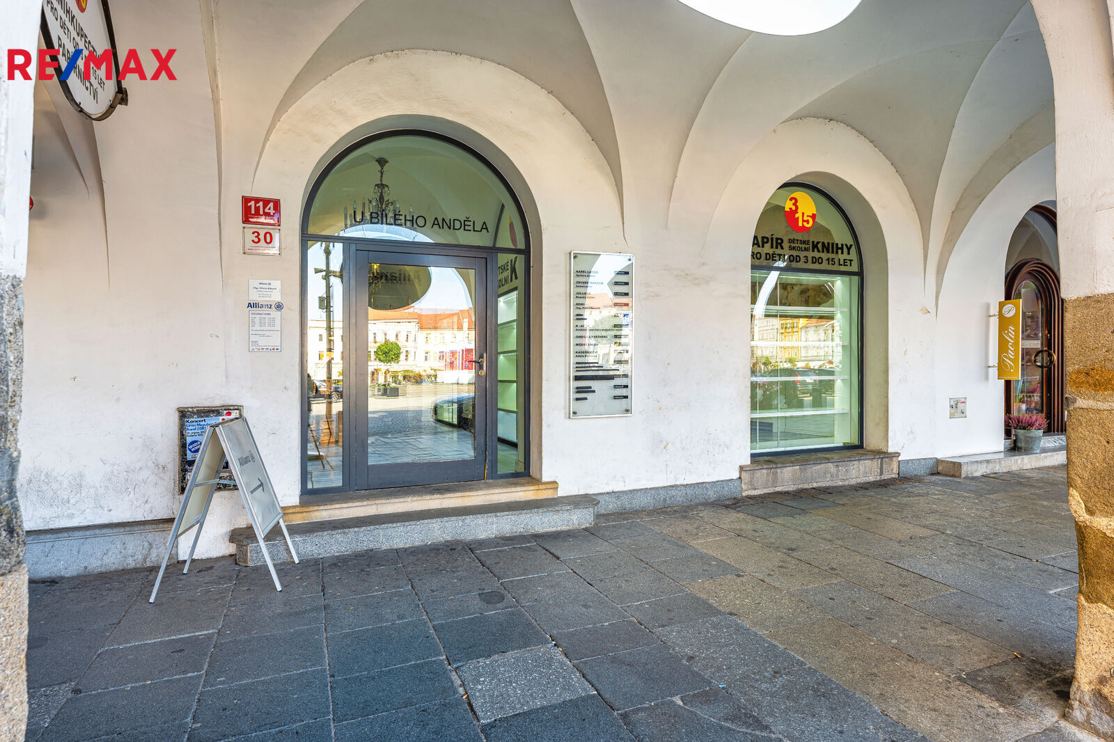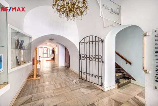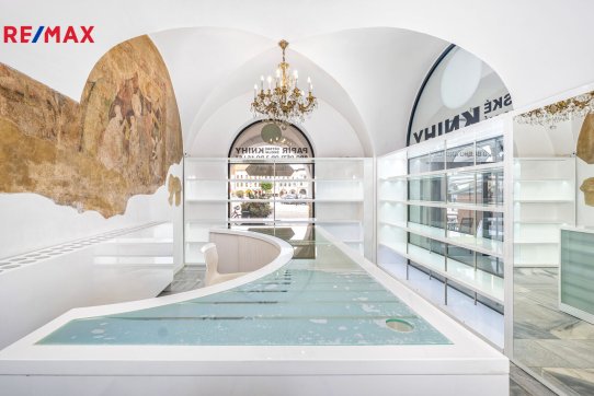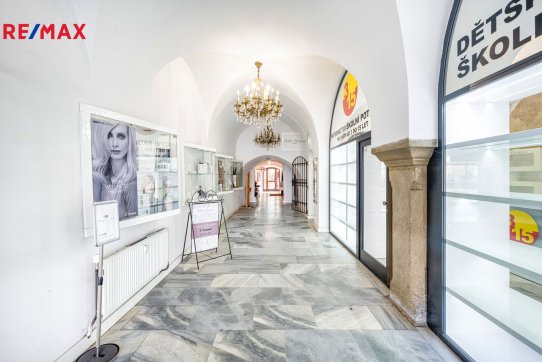 V prvním patře je kadeřnický salon s vlastním soc. zařízením o výměře 54 m2 a další prostor - 96 m2, kanceláře se soc. zařízením s okny na náměstí.