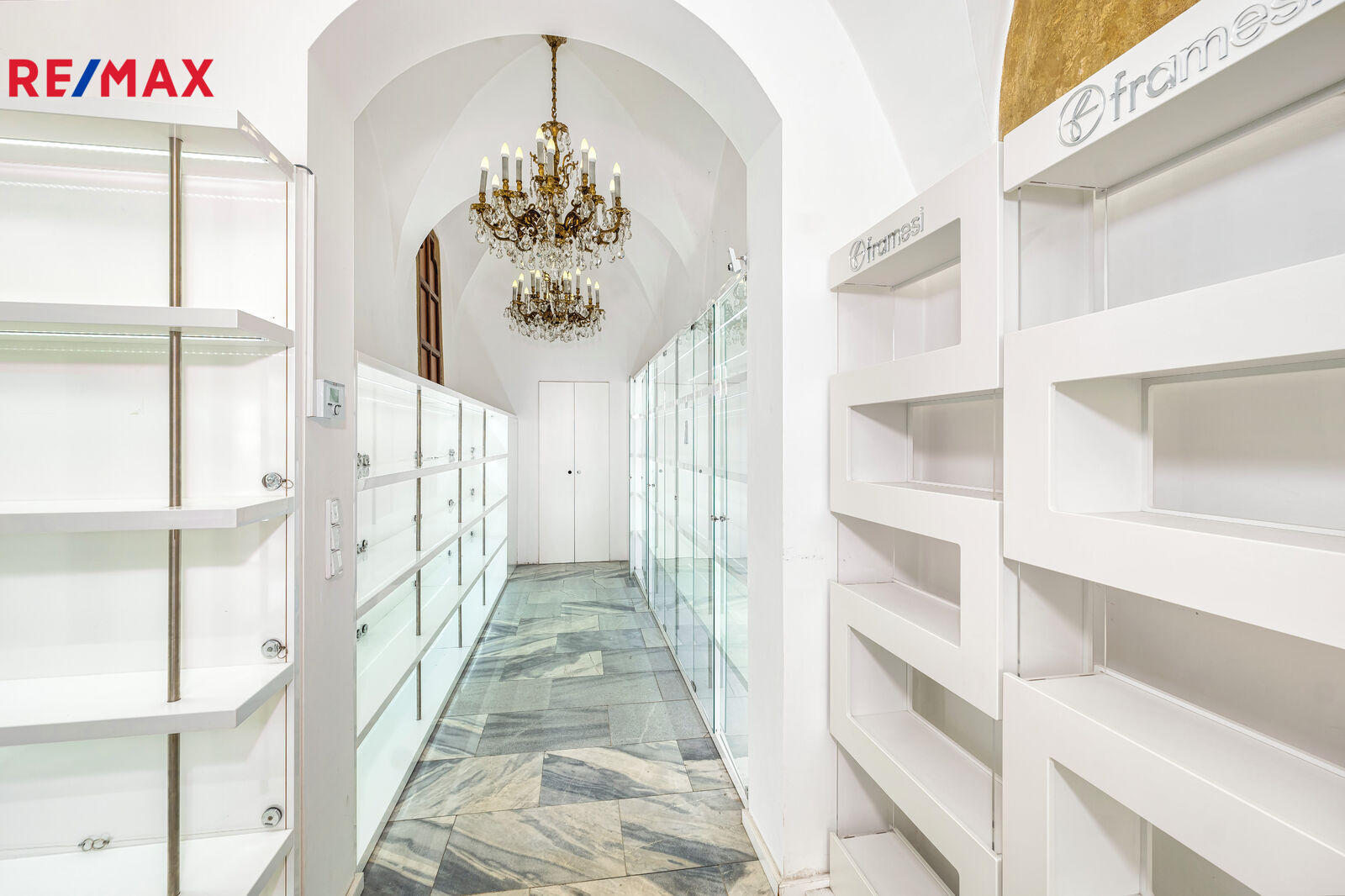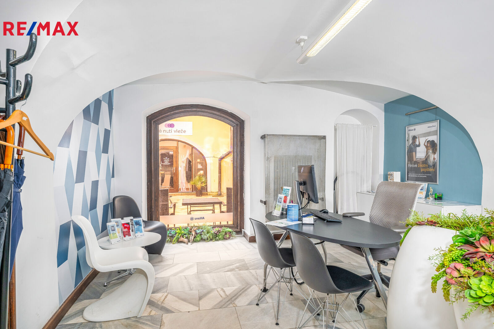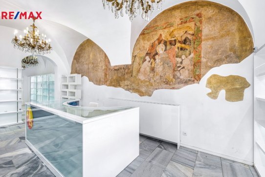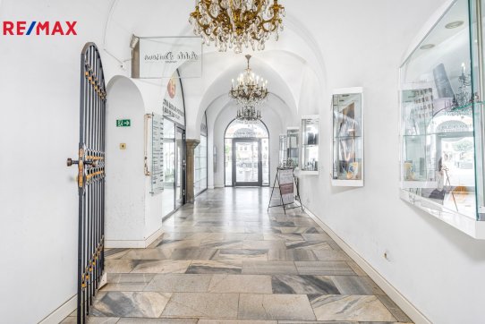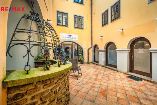 Pokračujeme-li chodbou, míjíme schodiště do patra budovy a dále se dostáváme ke vstupu do zajímavé klenuté provozovny o výměře 36 m2, která má výlohu na příjemný dvorek domu.