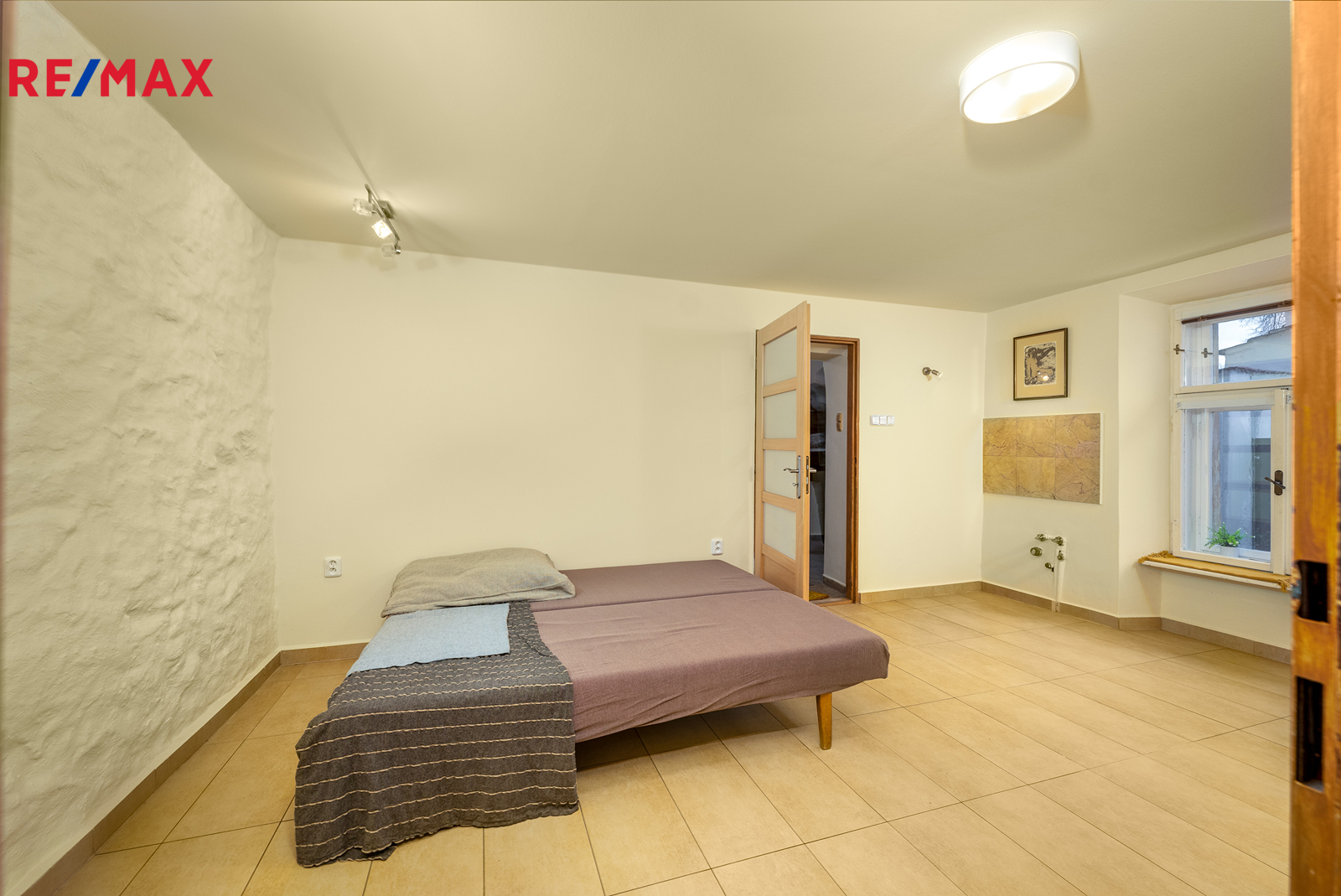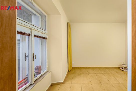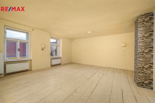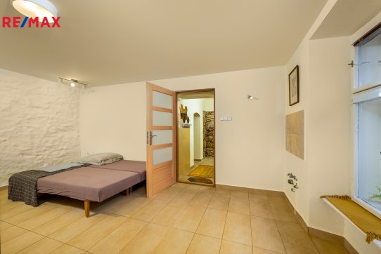 Tomuto podlaží dominuje velká obytná a světlá místnost (cca 33 m2) se zachovanou masivní dřevěnou podlahou a dále je zde další samostatná místnost (s hotovými rozvody např. na další kuchyň nebo koupelnu) a vstup do horní části přístavku nad místem pro kryté sezení na dvorku.