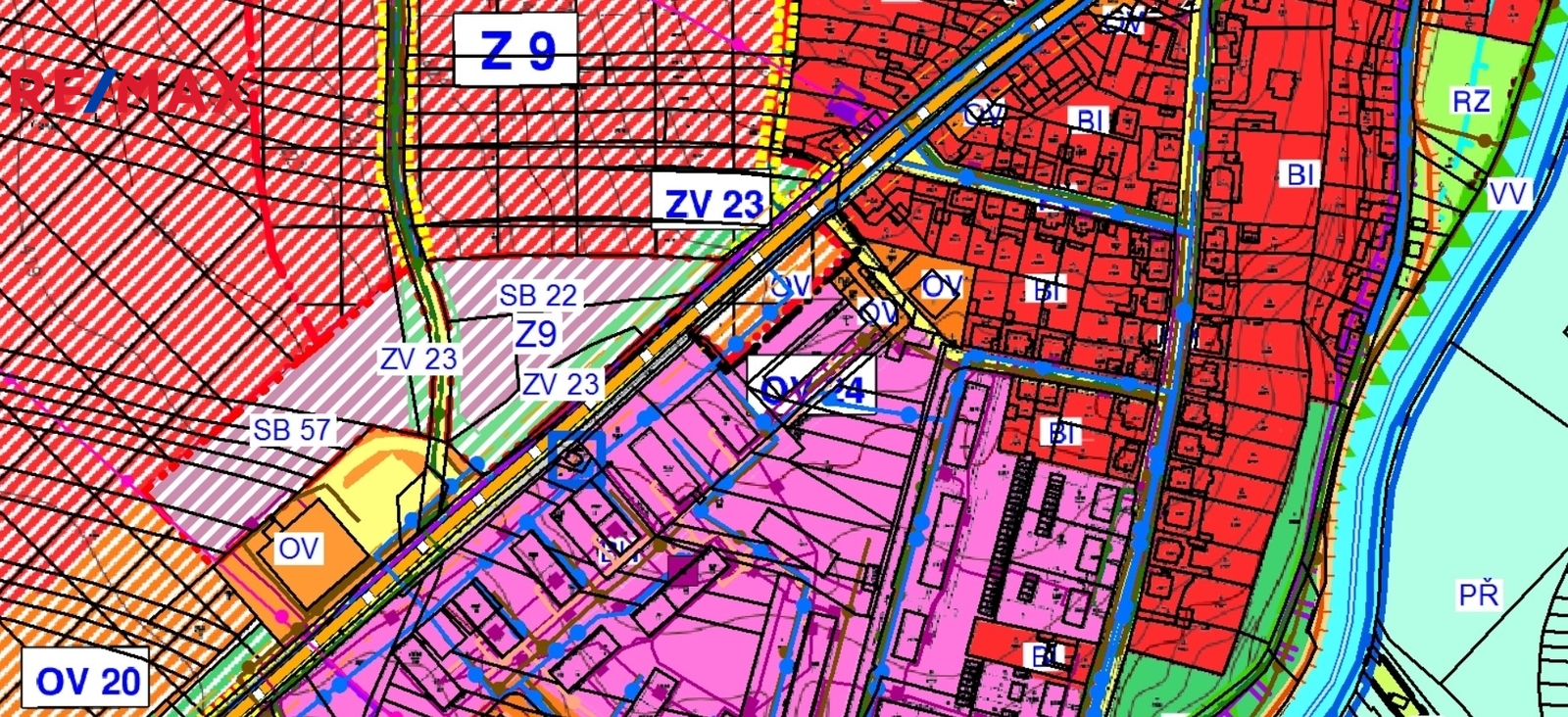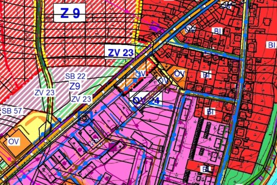 Část pozemku o výměře cca 1750 m2 je určeno dle územního plánu pro využití jako plochy občanského vybavení – veřejná infrastruktura, komerční zařízení – OV.
