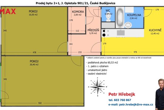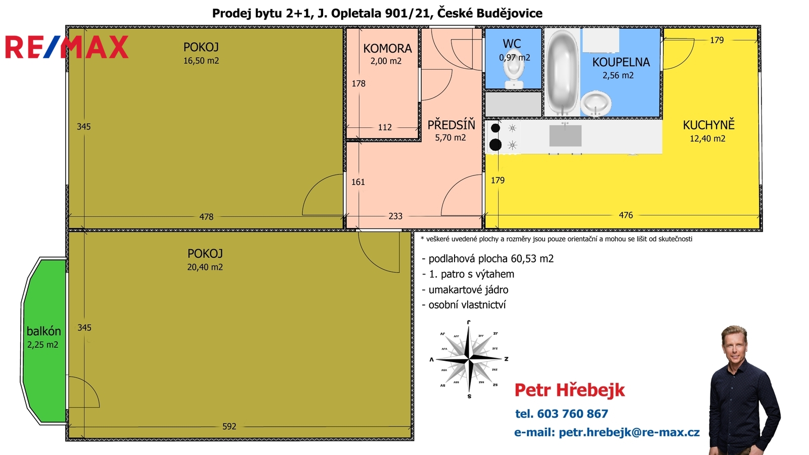 Nabízíme ke koupi prostorný byt 2+1 s balkónem umístěný v 1. patře panelového domu s výtahem. Byt v osobním vlastnictví se nachází na sídlišti Šumava v ulici J. Opletala a jeho okna jsou směřována na východ a západ. Má celkovou výměru 63,98 m2, z toho je balkón 2,25 m2 a sklep 1,20 m2.