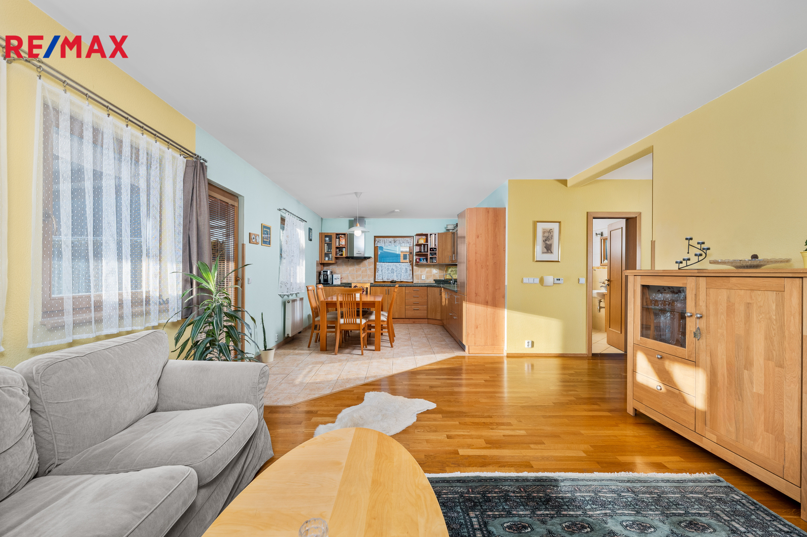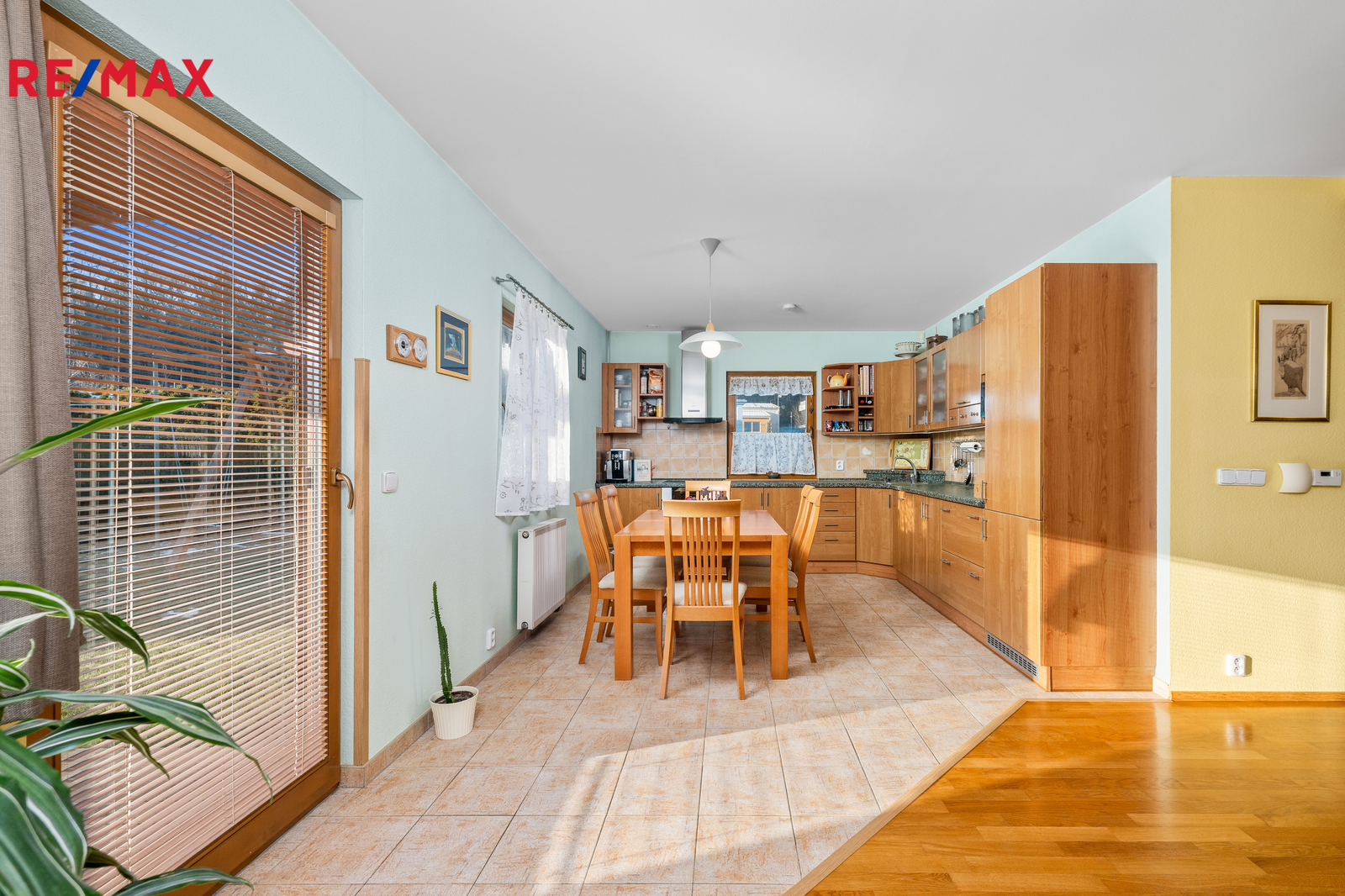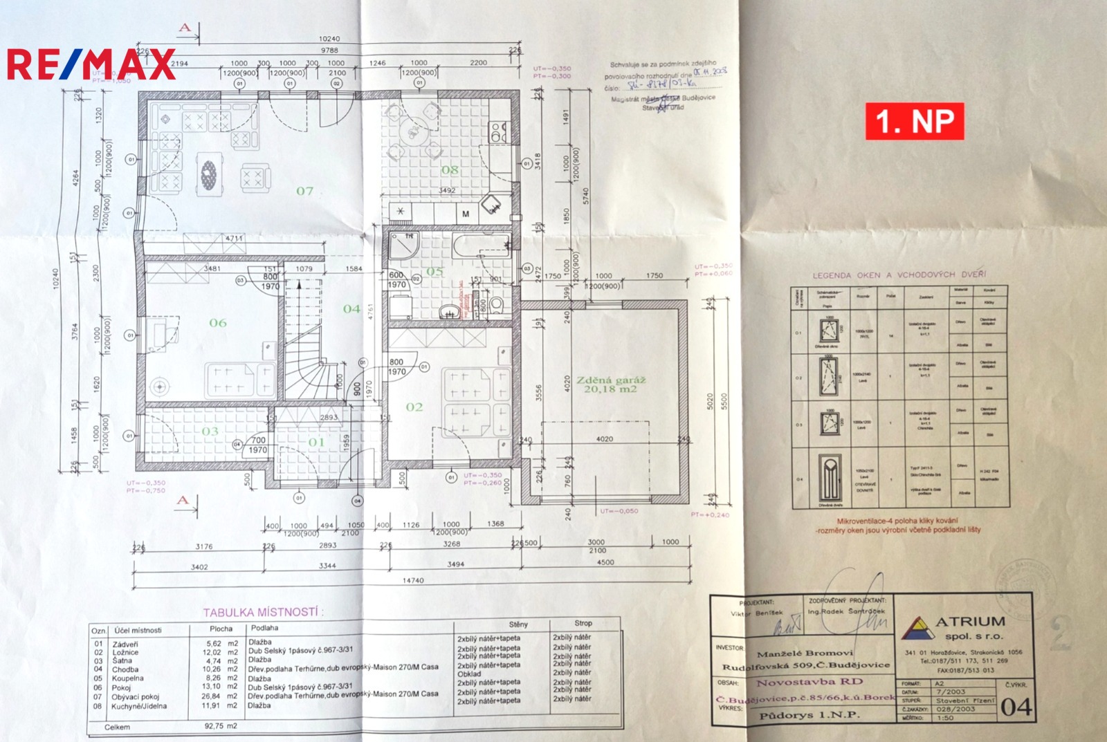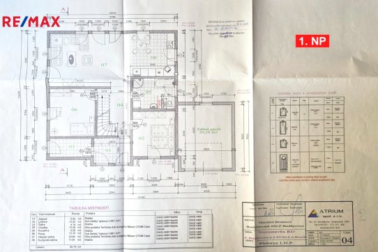1.NP - zádveří, komora, obývací pokoj s kuchyňským koutem a jídelnou, koupelna s WC a 2 pokoje