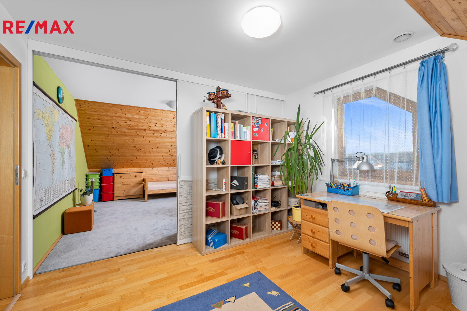 2.NP - ložnice, 2 dětské pokoje oddělené posuvnou příčkou, technická místnost se skladem, koupelna s WC