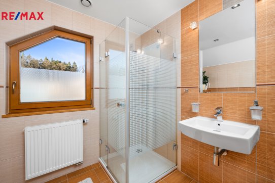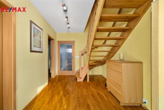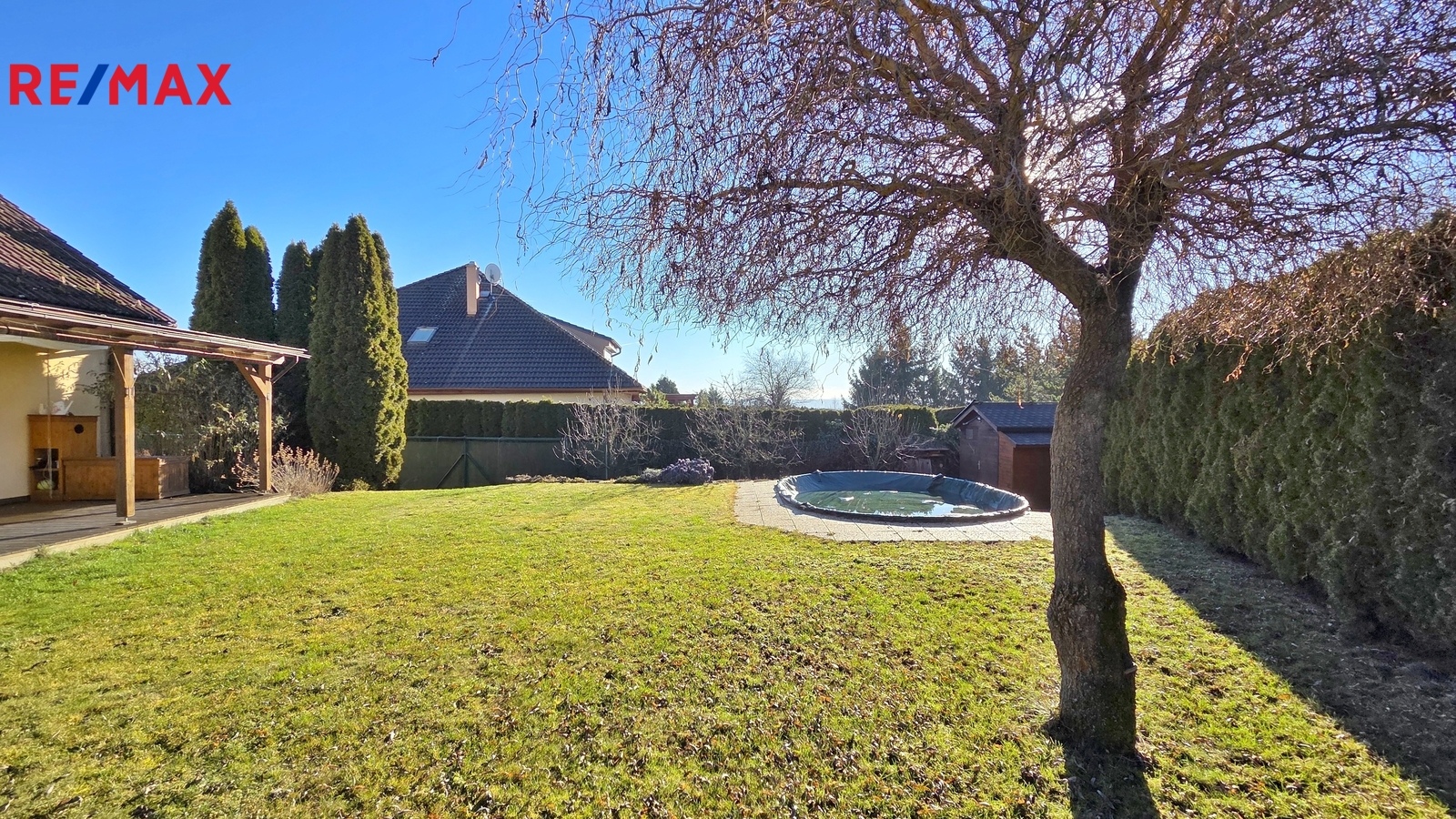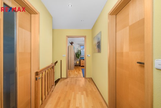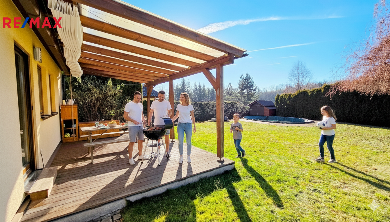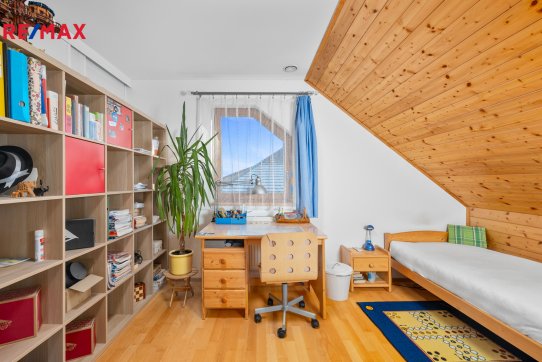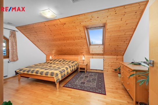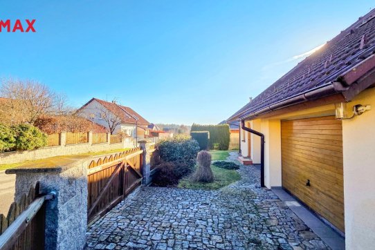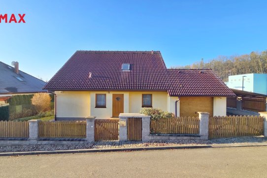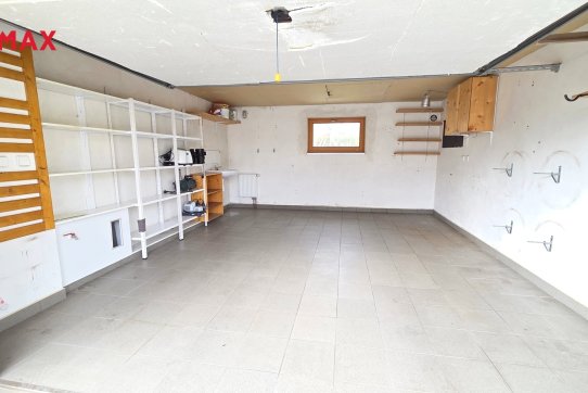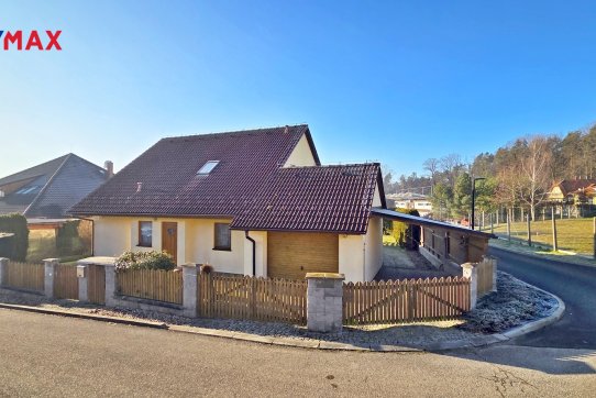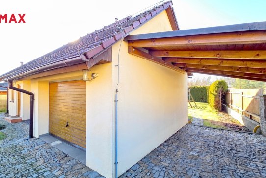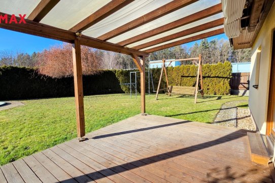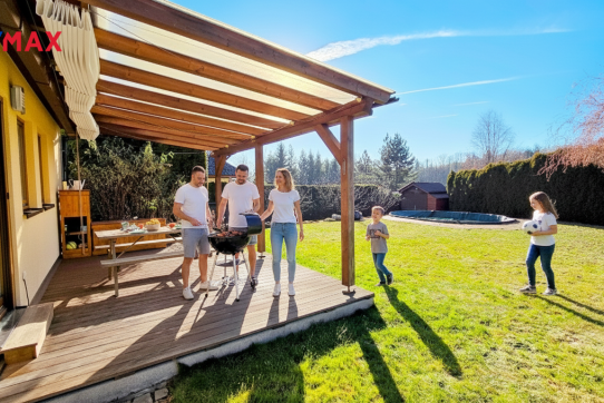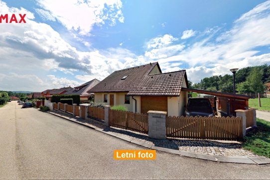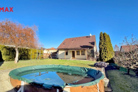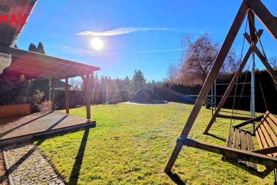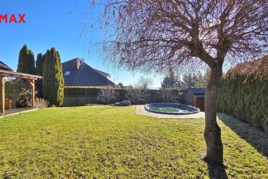 Nové majitele jistě potěší i dvě půdy vhodné pro ukládání věcí, jedna nad domem a druhá nad garáží. Příjemným bonusem je přímý vstup z obývacího pokoje na prostornou zastřešenou terasu, kde si můžete užit grilování a v horkých dnech i koupání v částečně zapuštěném bazénu 5,5 x 3,5m. Bazén je vybaven solnou technologií s pískovou filtrací. O příjemnou teplotu vody se postarají solární kolektory umístěné na zahradním domku, kde najdete i technologii bazénu.