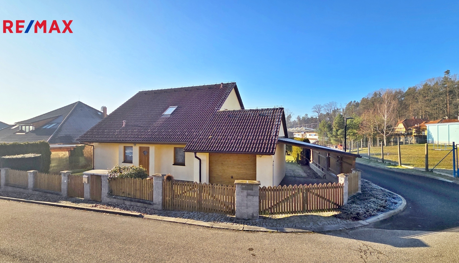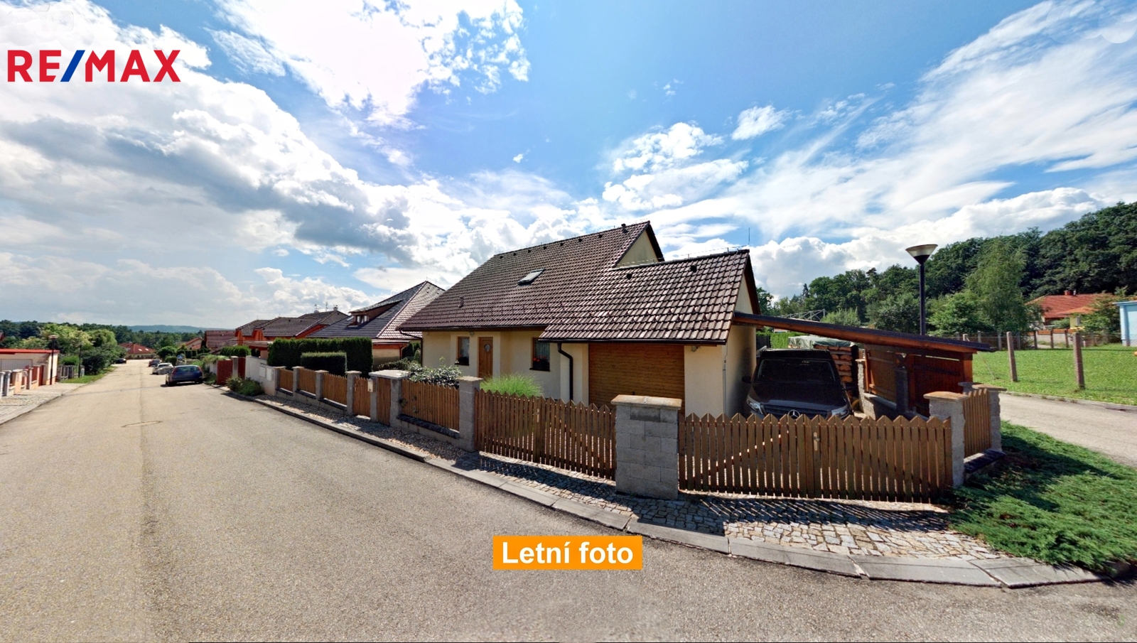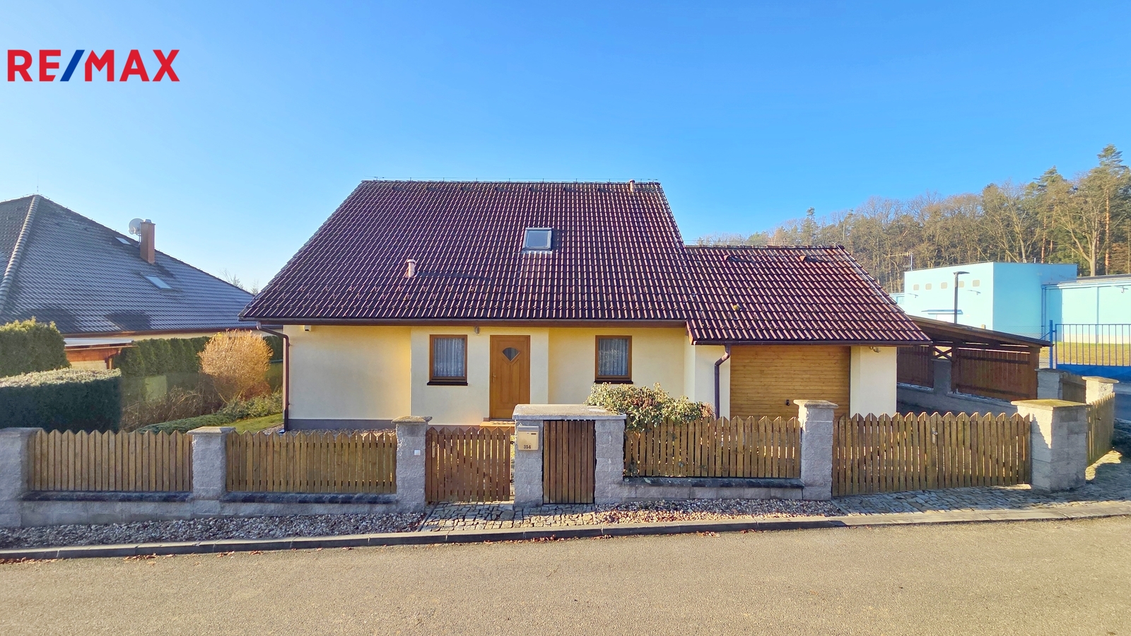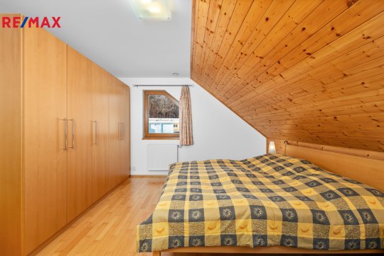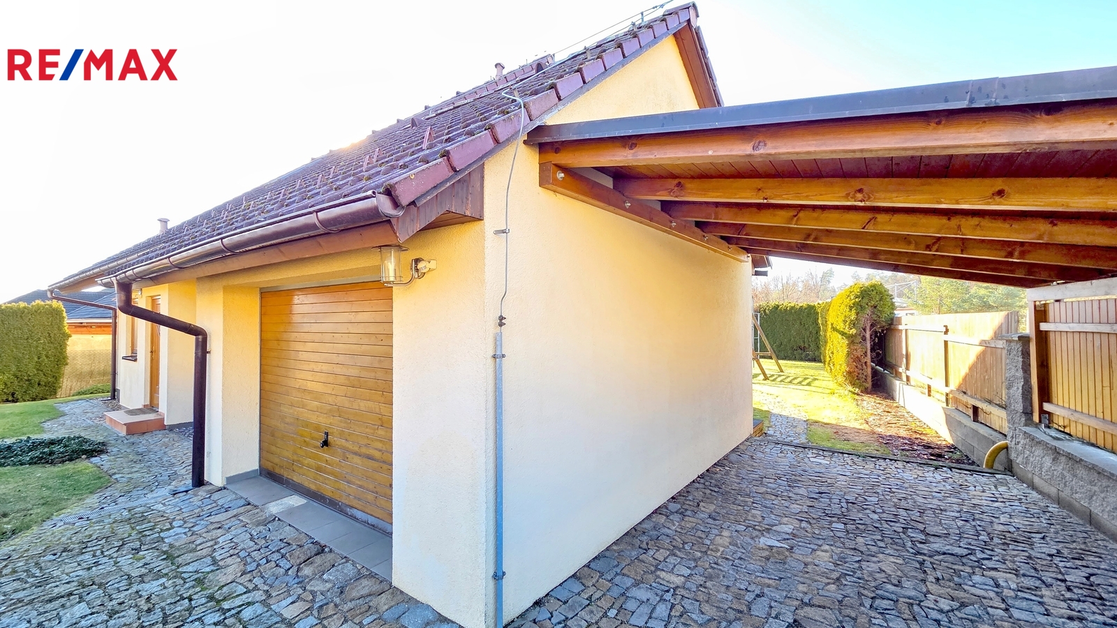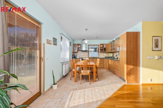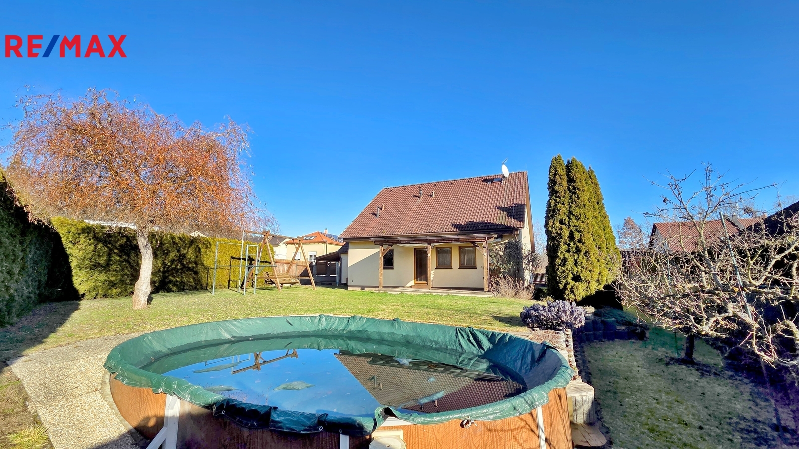 Nové majitele jistě potěší i dvě půdy vhodné pro ukládání věcí, jedna nad domem a druhá nad garáží. Příjemným bonusem je přímý vstup z obývacího pokoje na prostornou zastřešenou terasu, kde si můžete užit grilování a v horkých dnech i koupání v částečně zapuštěném bazénu 5,5 x 3,5m. Bazén je vybaven solnou technologií s pískovou filtrací. O příjemnou teplotu vody se postarají solární kolektory umístěné na zahradním domku, kde najdete i technologii bazénu.