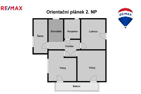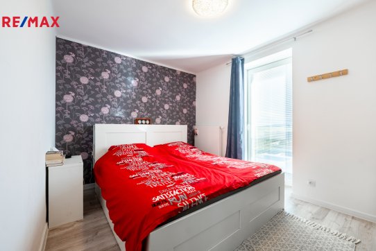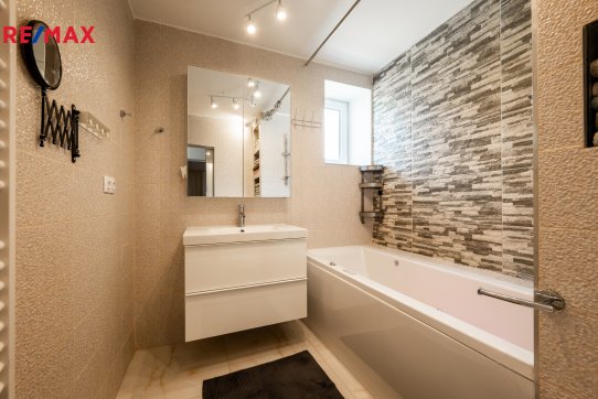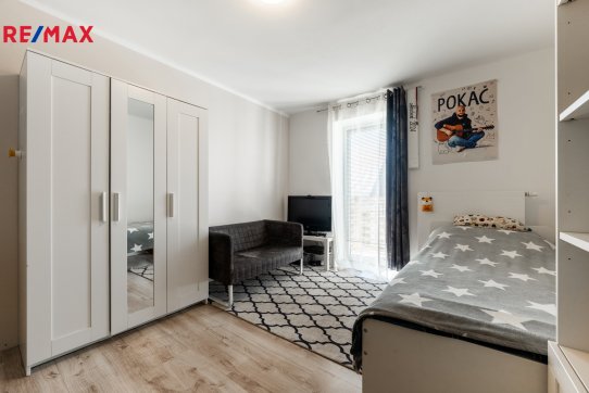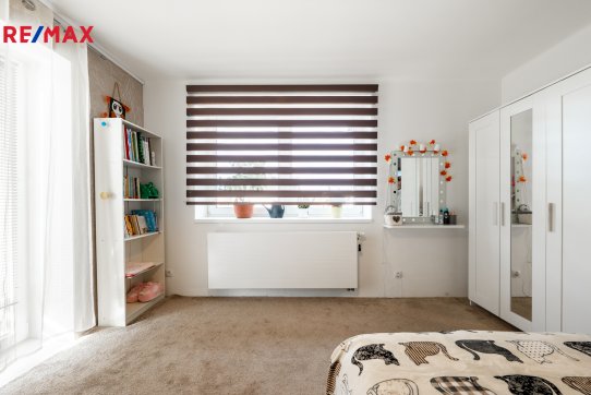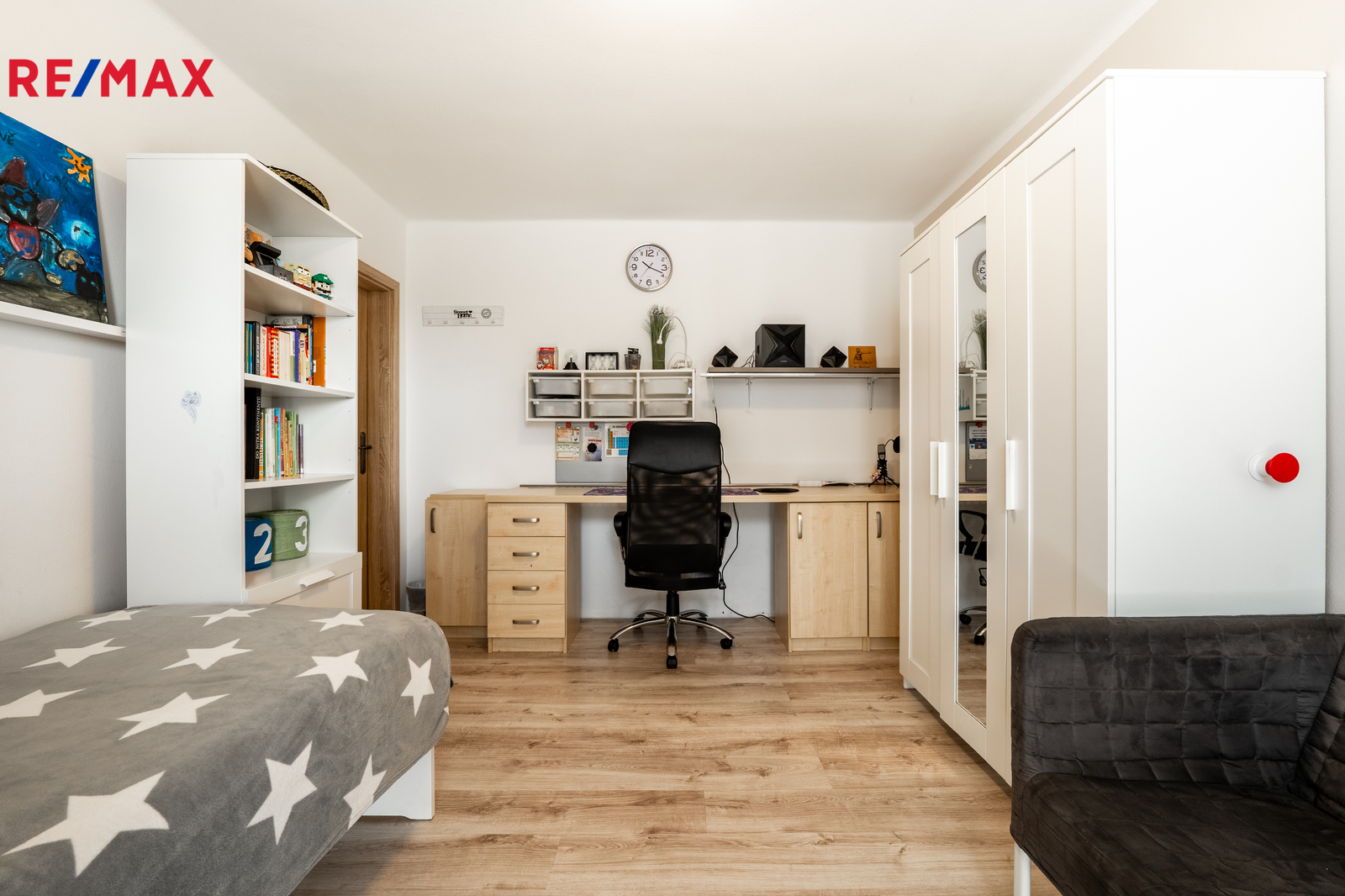 V patře jsou dva útulné dětské pokoje. Z obou se dá jít na balkon směřující na jih. Dále je zde ložnice, praktická šatna a koupelna s masážní vanou a s WC.
