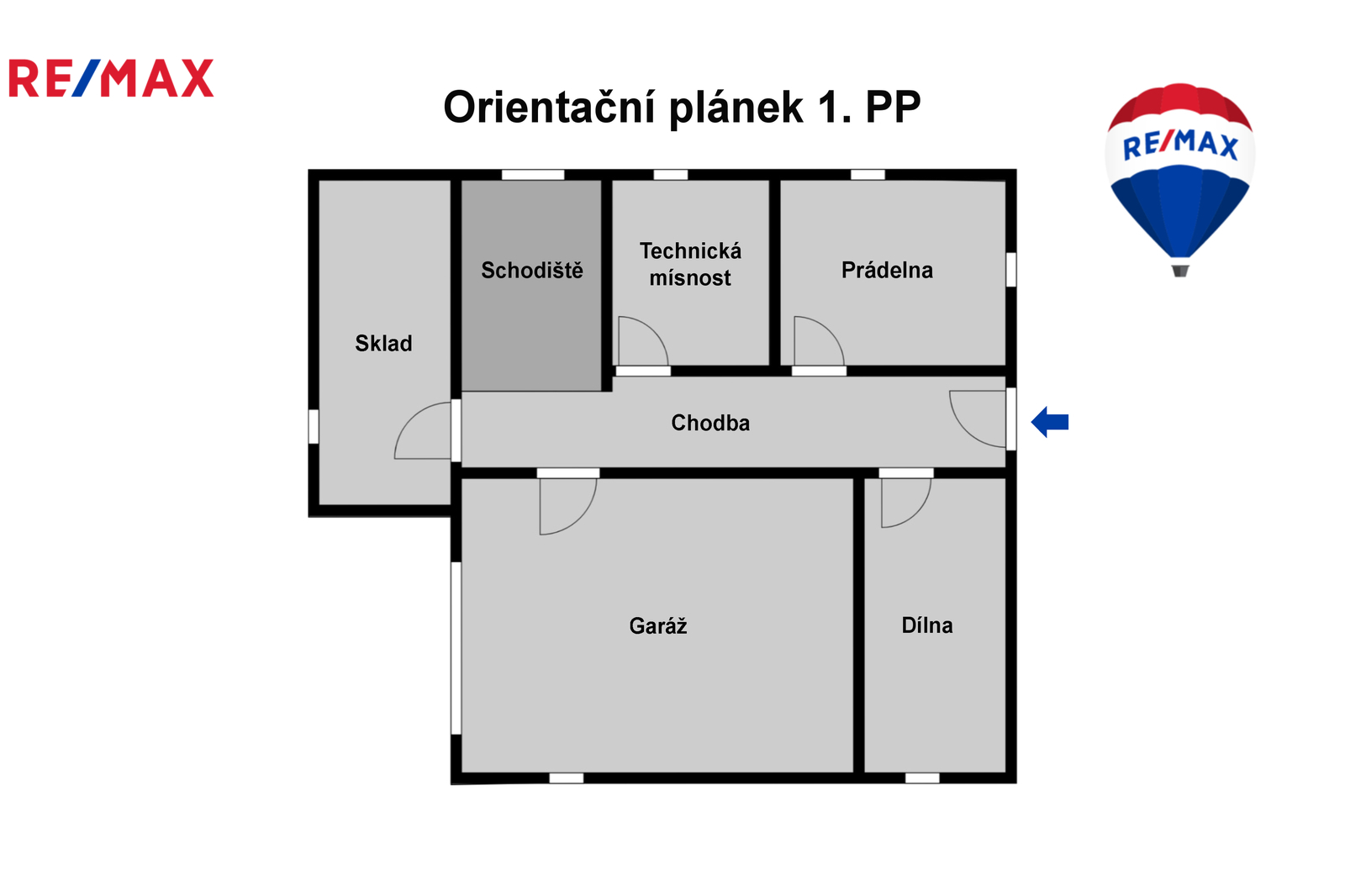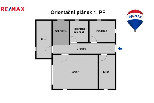 Ve sklepě se nachází sklad, technická místnost, prádelna, kde se počítá s další koupelnou, dílna a garáž.