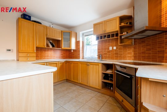 V přízemí dominuje obývák s krbem a vstupem na terasu. Praktická je jídelna s průchodem do kuchyně. V kuchyni najdete plno možností k uložení potravin nebo kuchyňského vybavení. Je zde sporák s digestoří, horkovzdušná trouba, lednice a myčka nádobí. Za zmínku také stojí velká pracovní plocha a barový pult se židličkami.