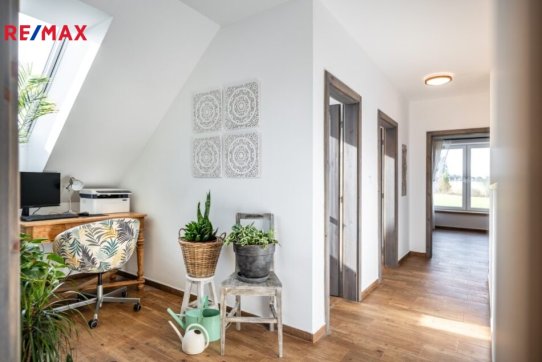 Interiér domu je kompletně hotový, velmi vkusně zařízený včetně moderní kuchyně a je laděn do harmonického celku, každý detail je součástí promyšlené koncepce příjemného bydlení.