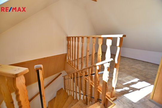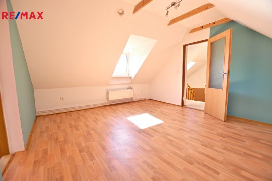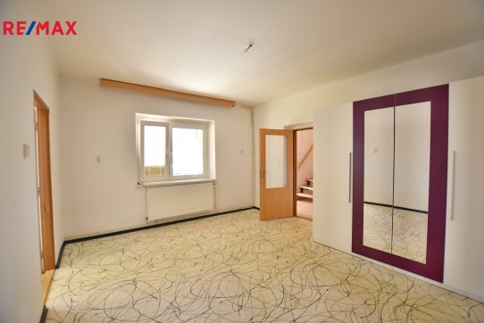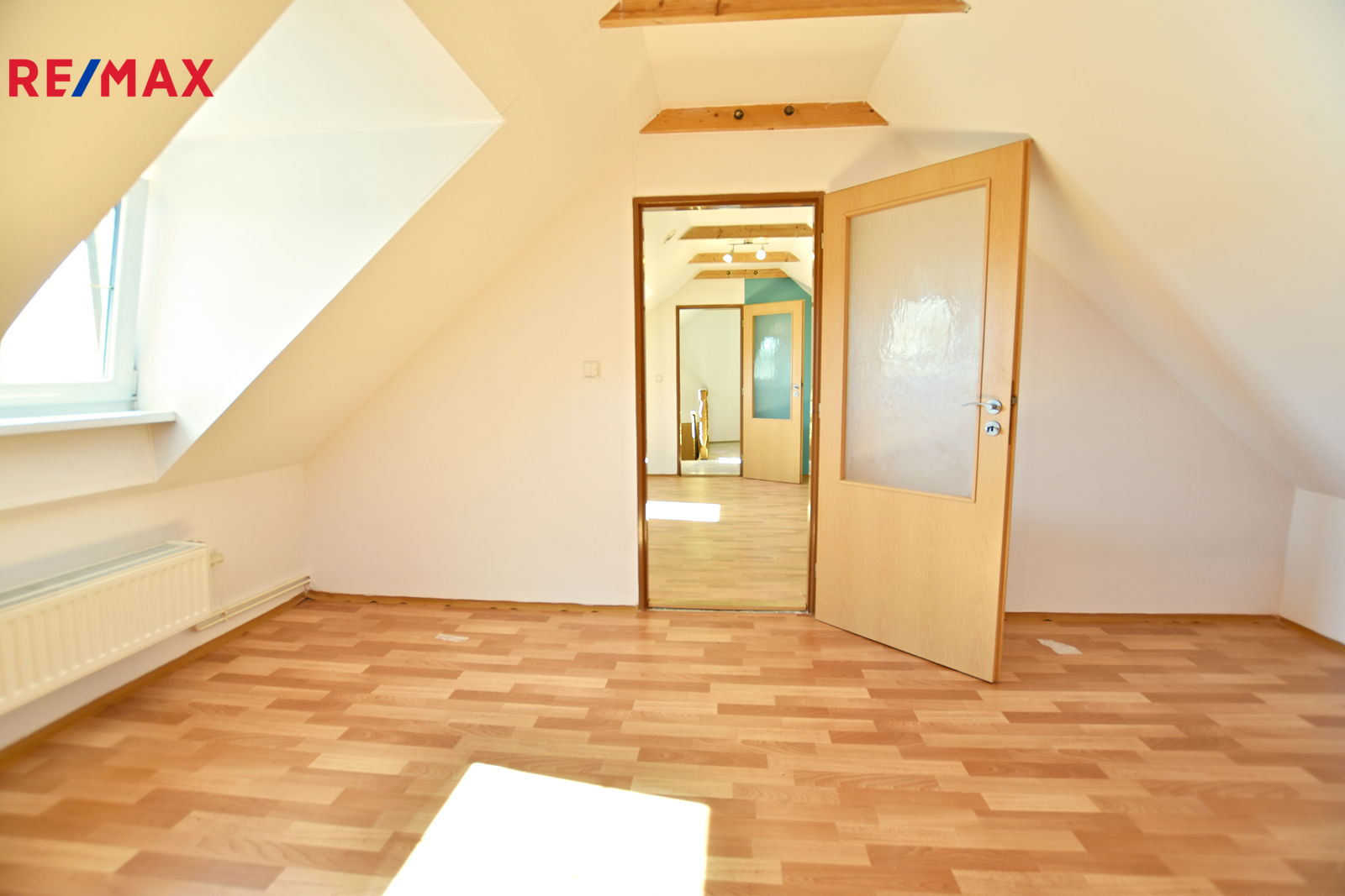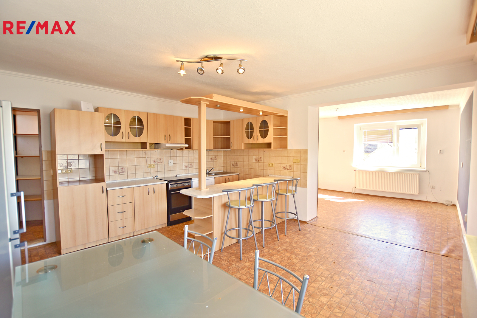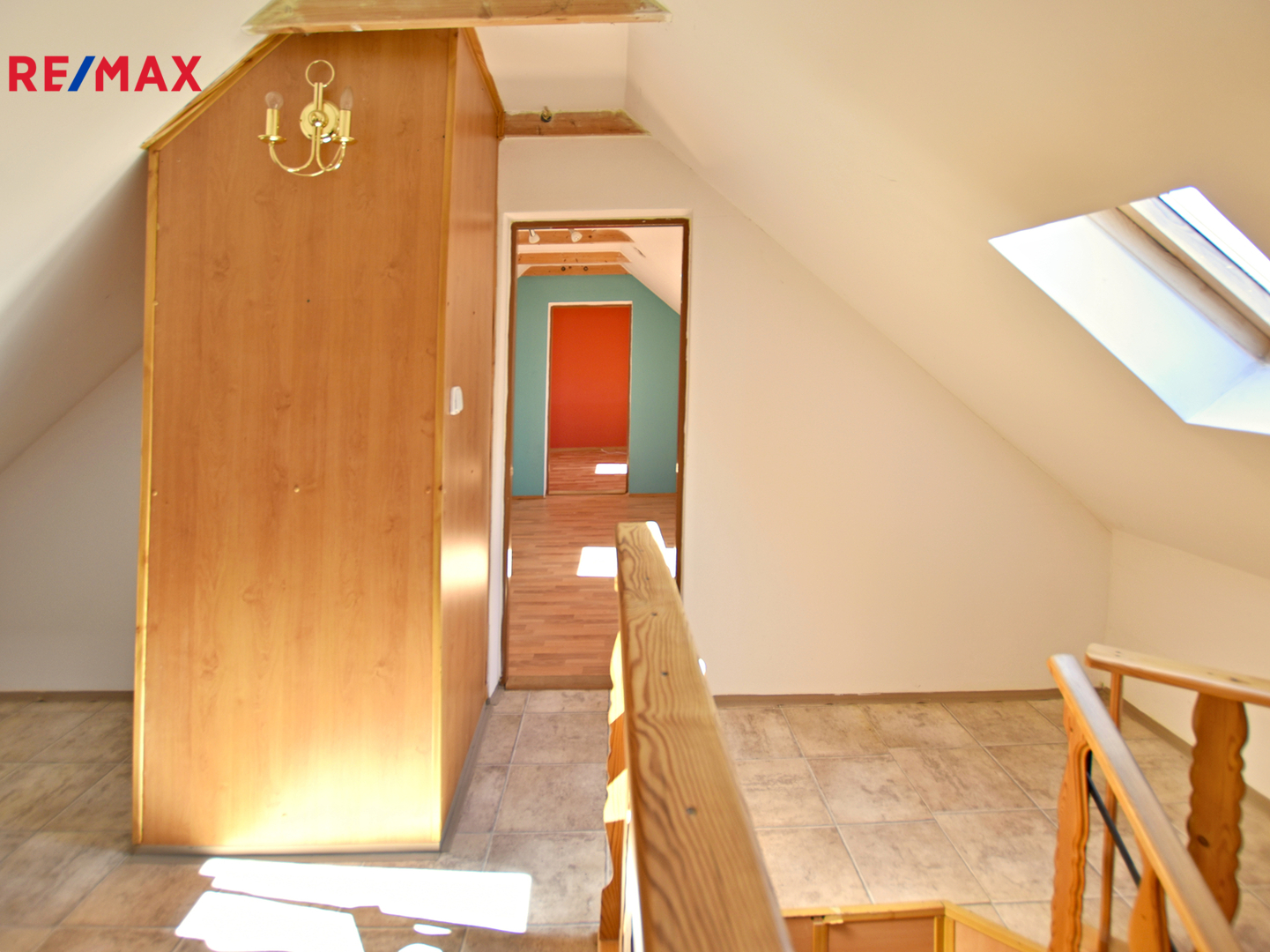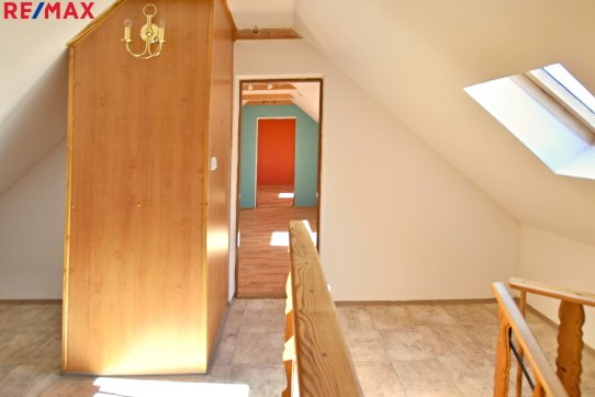 Rodinný dům s dispozicí 5 + kk prošel v minulosti zásadní rekonstrukcí se úpravou dispozic a vybudováním obytného podkroví. V přízemí domu se nachází zádveří s navazující centrální chodbou a vstupy do všech částí. Hlavní obytný prostor (38 m2) na tomto podlaží je tvořen obývacím pokojem s navazující kuchyňskou a jídelní částí. Dále jsou v přízemí 2 samostatné obytné pokoje (každý 20 m2), koupelna se sprchovým koutem, umyvadlem a místem na pračku a samostatné WC. V podkroví domu je prostorná podesta a další 2 pokoje (každý 17,5 m2). Dům je částečně podsklepený – ve sklepě je kotelna a technická místnost.