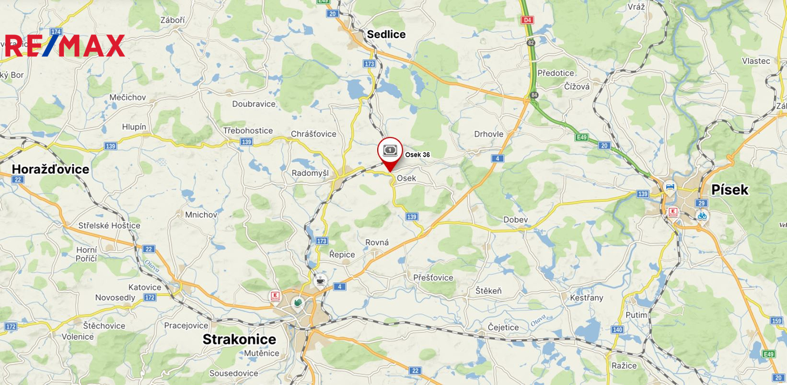 Nemovitost se nachází na adrese Osek 36, vzdálené 2 km od městyse Radomyšl, 10 km od Strakonic a 15 min od Písku.